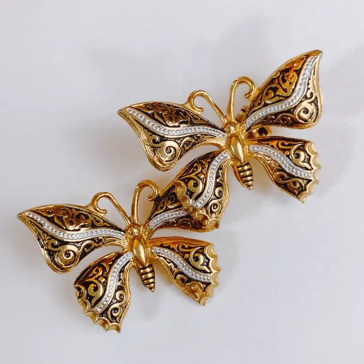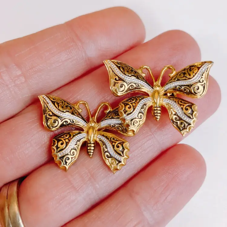 Features: Butterfly design; double insect motif; layered dimensional construction; white enamel with beaded effect; ornate filigree-style scrollwork