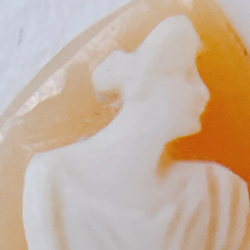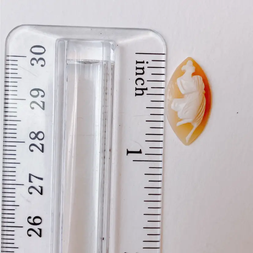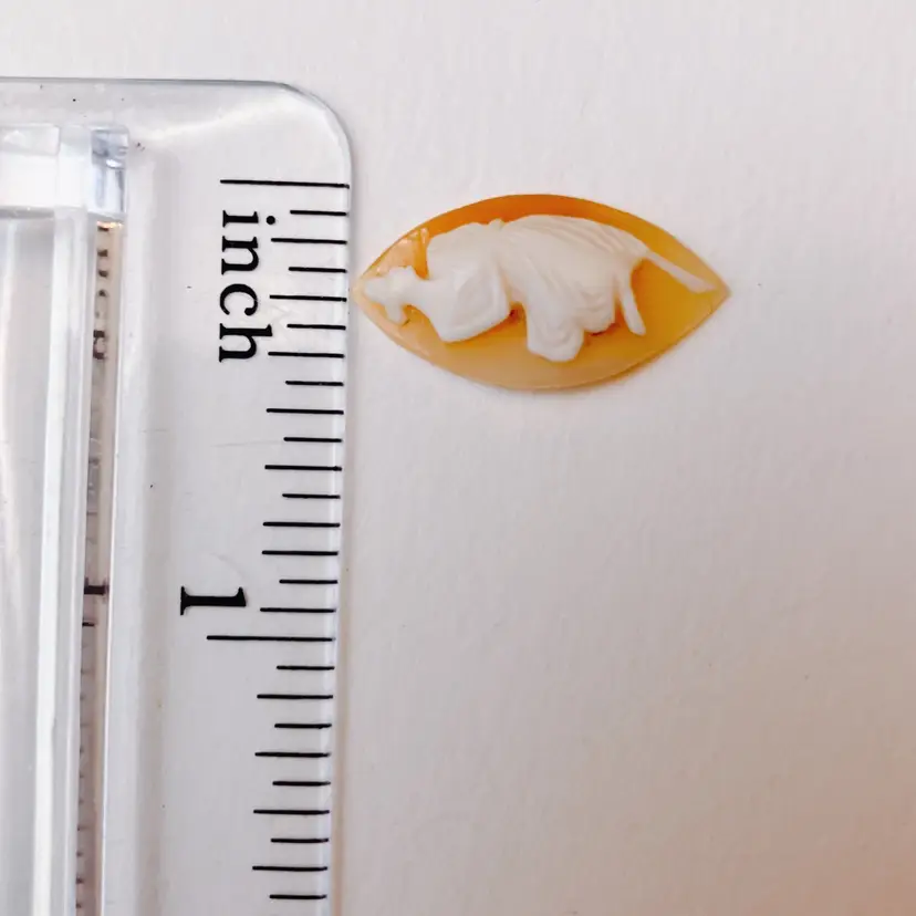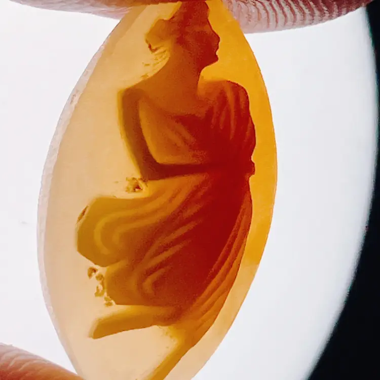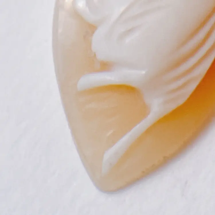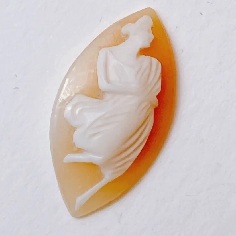 Features: Navette shape; high-relief carving of classical draped female figure; translucent caramel-to-cream shell layering; hand-finished detailing