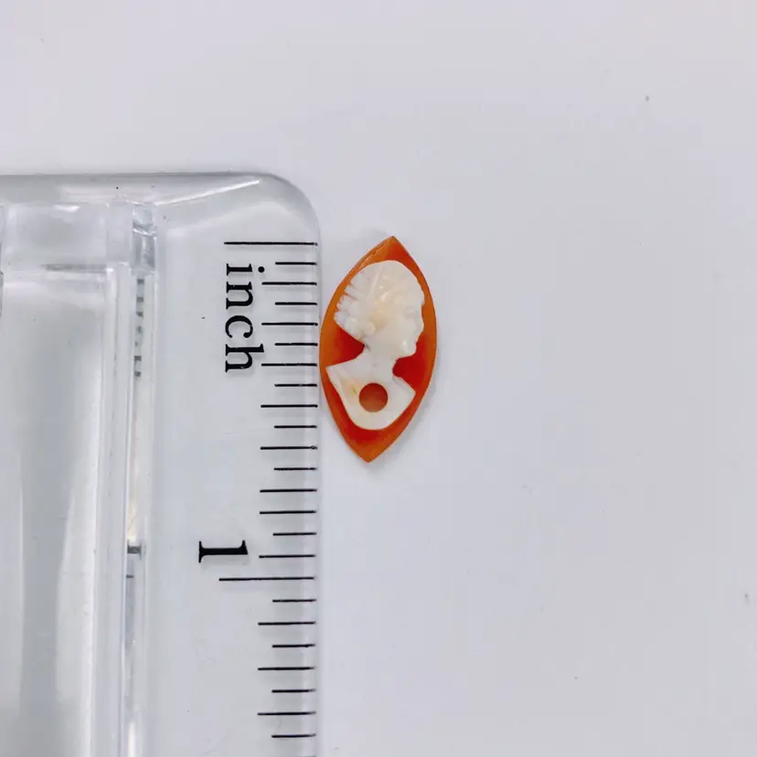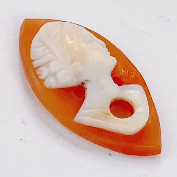 This lovely hand-carved shell cameo features a neoclassical female profile in layered orange-pink and white shell, with a navette shape and drilled holes for integration into custom designs or repairs. A classic mid-century supply piece with timeless appeal. Cameo is loose and unmounted, waiting for a collector or artisan.
