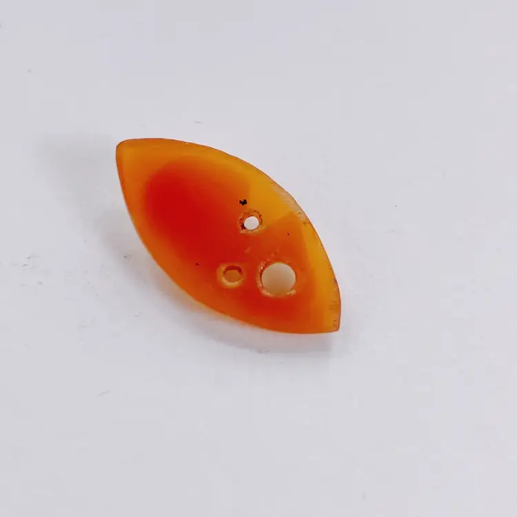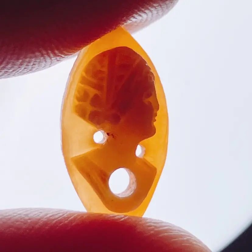 Features: Navette shape; three drilled holes; translucent orange-pink shell base; female profile motif in white shell layer; light passes through shell under strong backlight