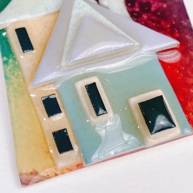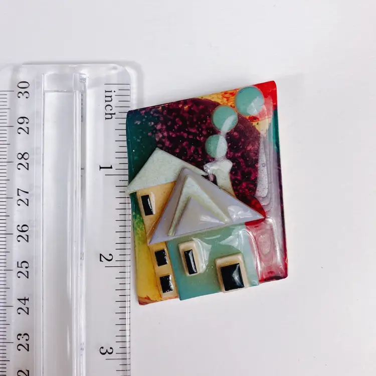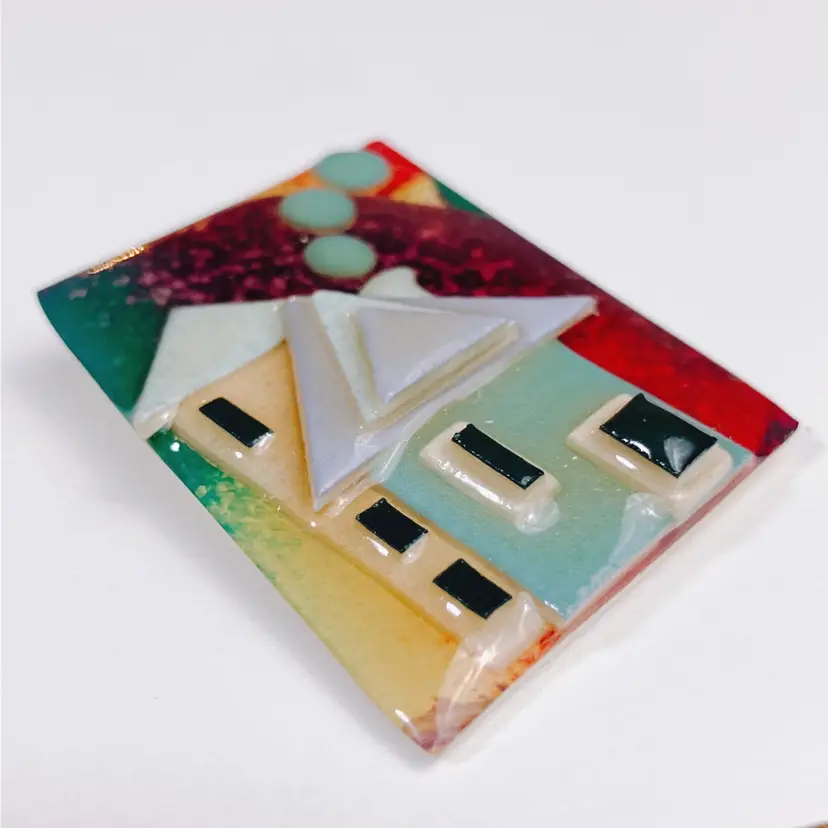 Features: Layered dimensional house motif; multicolor abstract collage background; molded roof and chimney detail; attached pin-back hardware
