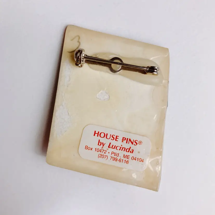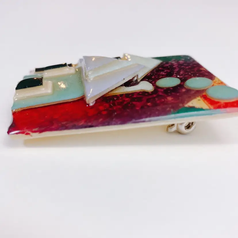 A playful blend of color and dimension, this handmade brooch from Lucinda's iconic House Pins line captures the quirky charm of late-'90s wearable art. A perfect conversation starter for lovers of artisan jewelry and bold design.