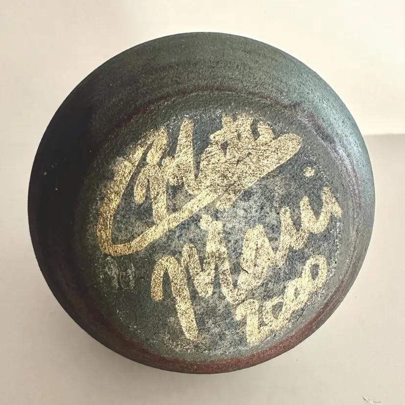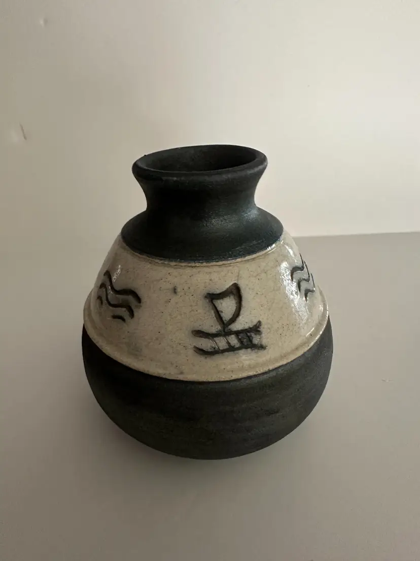 This beautiful vase is a unique piece of Hawaiian culture. The artist, C. Matti, has signed this raku-fired pottery vase with stunning petroglyphs. The vase is handmade and features a grey color with a raku glaze finish. The vase is perfect for those who appreciate Hawaiian art and history. It is a great addition to any collection or as a decorative piece for any home or office. This vase is a must-have for anyone who loves Hawaii and its rich culture. 5 inches tall, 4.5 inches at middle.