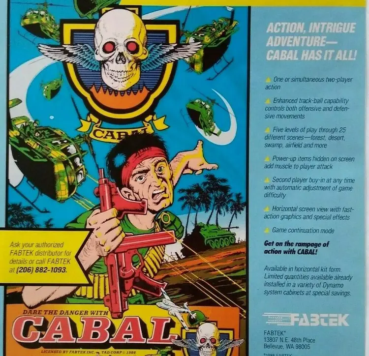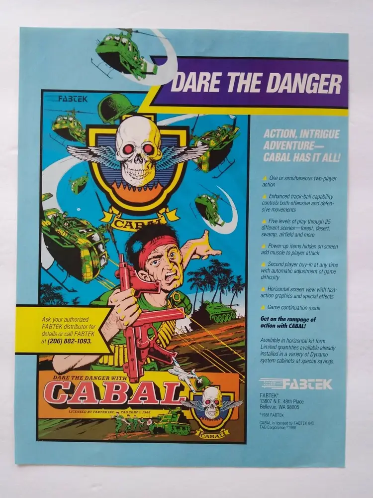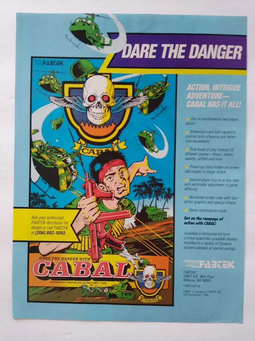 Modified Item: Yes Country/Region of Manufacture: United States Original/Reproduction: Original Vintage Ad Not A Flyer Year: 1988 Game Title: Cabal Modification Description: Removed from trade magazine with edge wear. See notes. Brand: Fabtek