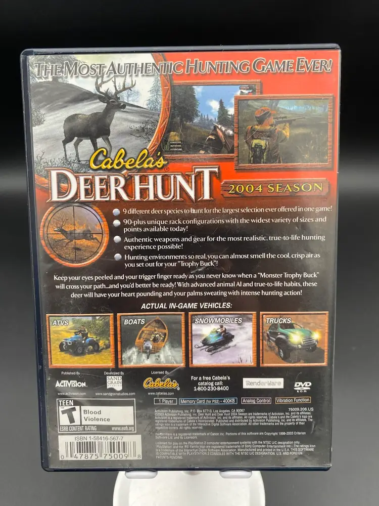 You are purchasing one Cabela's Deer Hunt 2004 Season PlayStation 2 Video Game by ActiVision from 2003. This Game is in overall great condition. No chips or cracks on the Case. No rips or stains on the Manual. Minor signs of wear on the Disc, tested in playable condition without issues.