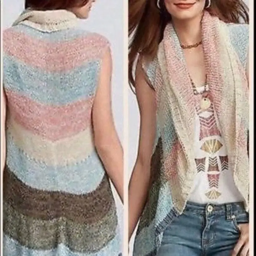 Women's sherbert line up circle sleeveless sweater vest from Cabi Knit Open Cardigan Vest. This is a great transitional piece to wear for several seasons. Great for layering! Multicolored Stripes - Color: Blue, coral, cream, brown, green, grey Size Small style #216 Great pre-owned condition, no flaws Please see all photos and measurements to ensure proper fit. Oversized flowy fit Measurements taken flat (unstretched): Armpit to armpit: 26.5" Shoulder to hem length: 27" 57% Cotton 43% Polyester Hand wash cold separately, do not twist or wring, lay flat to dry Open to reasonable offers Fast shipping Bundle & Save *Crossposted Smoke free home