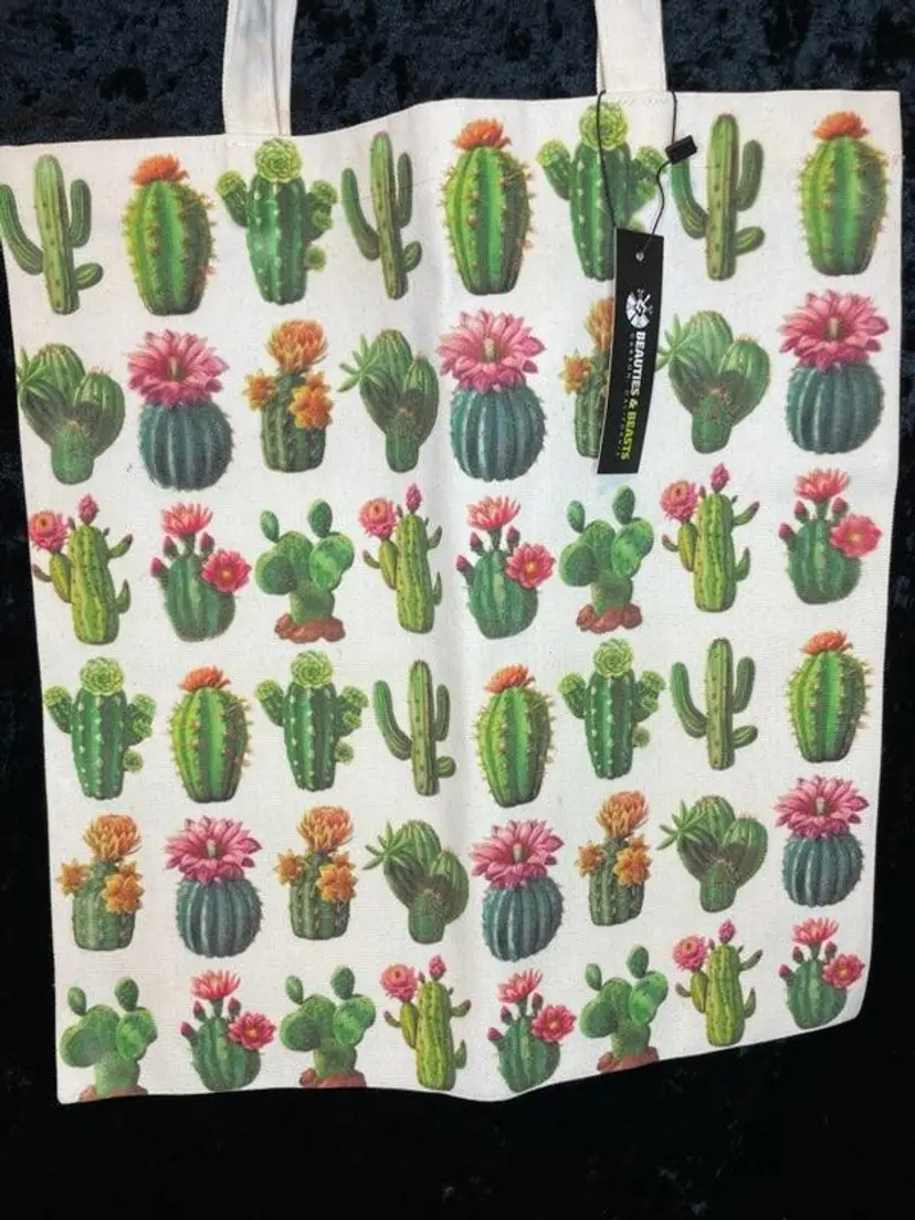 Durable handmade cotton canvas tote bags with vibrant cactus theme print -Cactus Parade- Approx size is 16" H x 15" W- Double side print-same print as shown -Cactus Garden -16"H x 15"W Single side print, with various cacti flowes -Cactus Garden 2- Approx 15"H x 13"W- Double side print, same print on both sides -Cactus Heart- Approx 16"H x 15"W- Single side print -Copiapoa Cactus 1- Approx 15"H x 15"W - Double side print as shown -Copiapoa Cactus 2- Approx 15"H x 13"W - Double side print as shown -Gymnocalycium Cactus Lover- Approx 15"H x 13"W- Single side, variuos pictures of gymnos. -Hug Your Cactus- Approx 15"H x 13"W- Single side print -Lophophora 1- Approx 15"H x 13"W- Single print side -Lophophora 2- Approx 15"H x 13"W- Single side print -Saguaro 1- Approx 16"H x 15"W- Single side print -Saguaro 2- Approx 15"H x 12"W- Single side print -Cacti Us- approx size 15"H x 12"W Single side print -Cactus Bag- Approx size 15"Hx13"W -Single side print