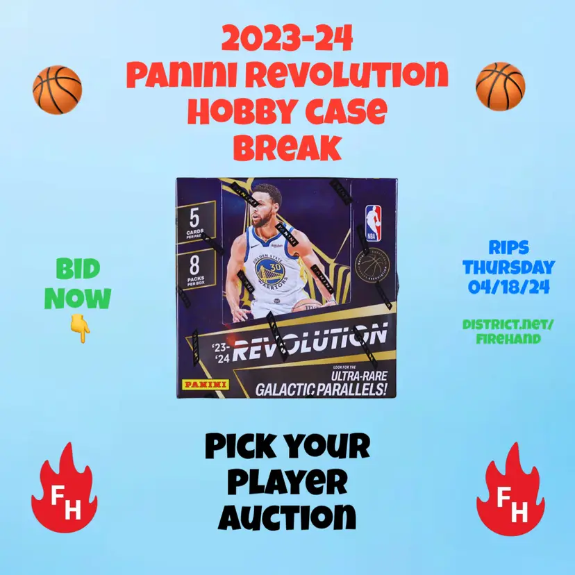 You are bidding on the cards of the player listed in the title in this Hobby Case of 2023-24 Panini Revolution Basketball Cards (8 Boxes). Auctions end Wednesday evening April 17; Case will be opened LIVE Thursday, April 18th, in the AM, with notifications to go out across the Firehand Cards community when live on District and simulcast to our YouTube channel (https://www.youtube.com/channel/UCETc4FyfADGzg3vTTww-Qew). US Shipping is $5 for your first auction spot won and only $.25 per each additional spot you win! Any spot won where no cards of the player are found in the box will receive a bonus card or pack from Firehand Cards. Any hits pulled (Cut Signatures etc.) of a player who is NOT listed in the auction will be assigned by draw between all participants. Any dual or multi-auto cards featuring multiple players will be randomized live between the spots depicted on the card. NOTE - team names are provided for search purposes only - it could be possible that the player listed now plays for a different team or has a different team on the card, you will still get ALL the cards associated with this player.