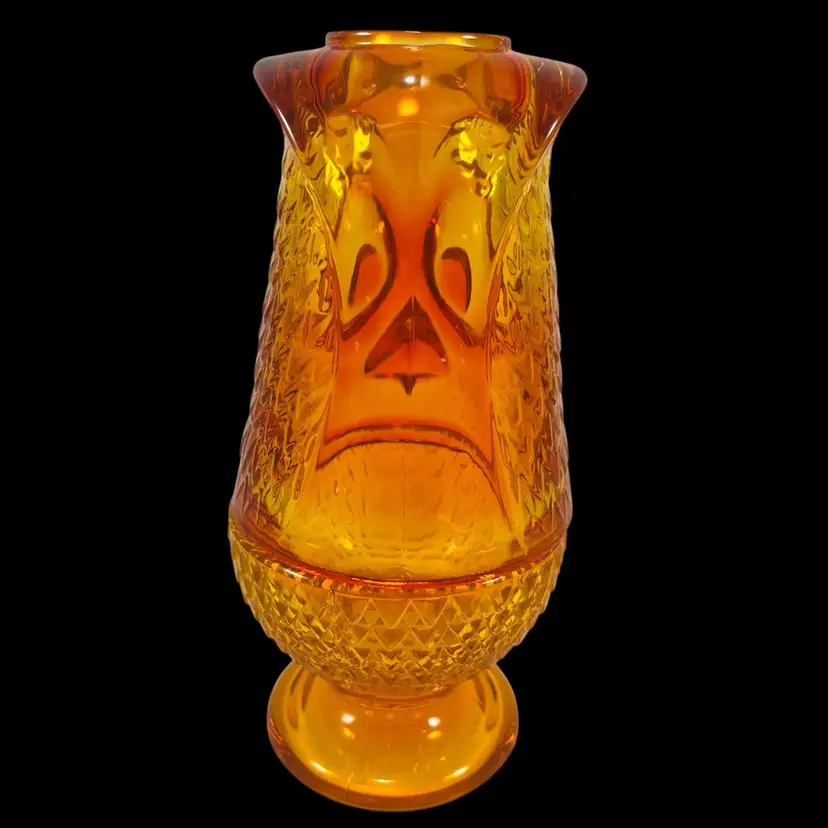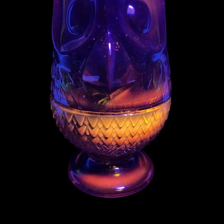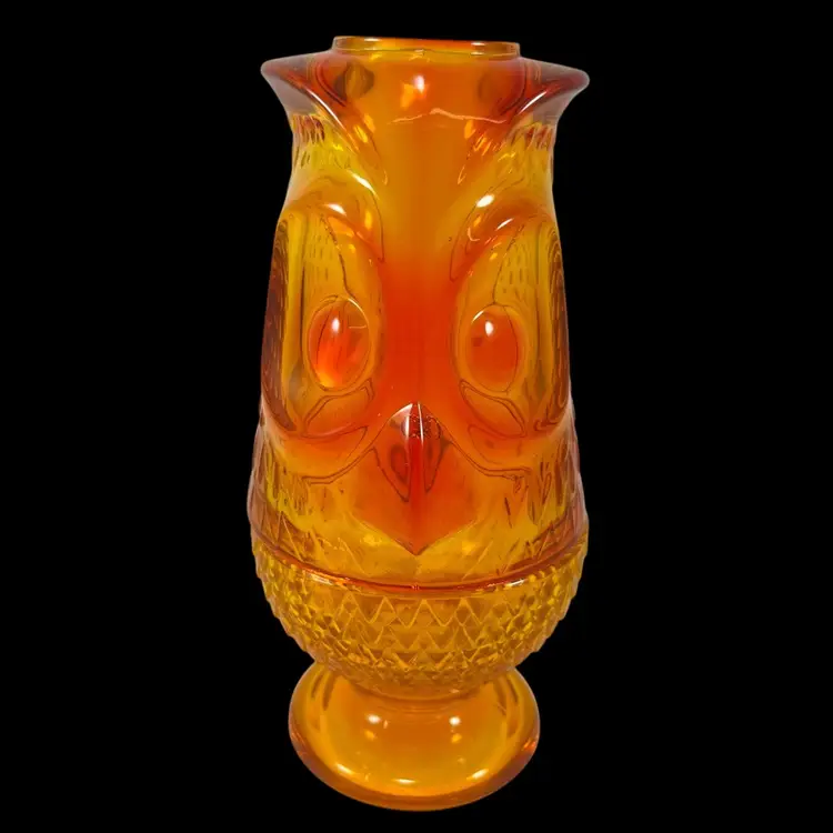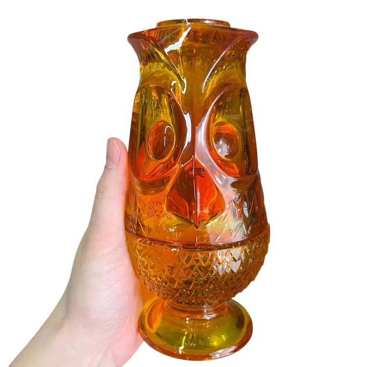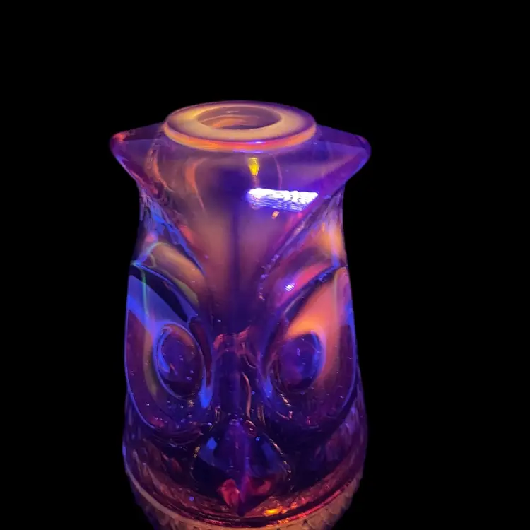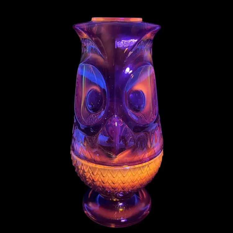 Approximately 6.75” tall and 3.25” in diameter at its widest point. No chips or cracks. A few tiny flea bites around the top rim of the owl head (photo #6). Otherwise beautiful condition. Lovely cadmium glow with a UV light.