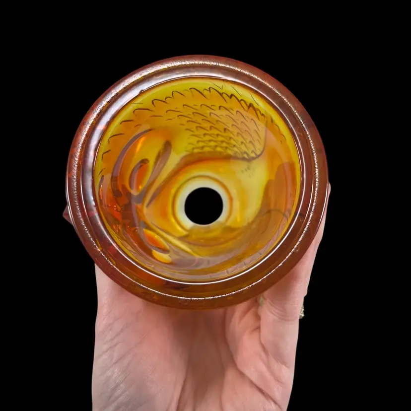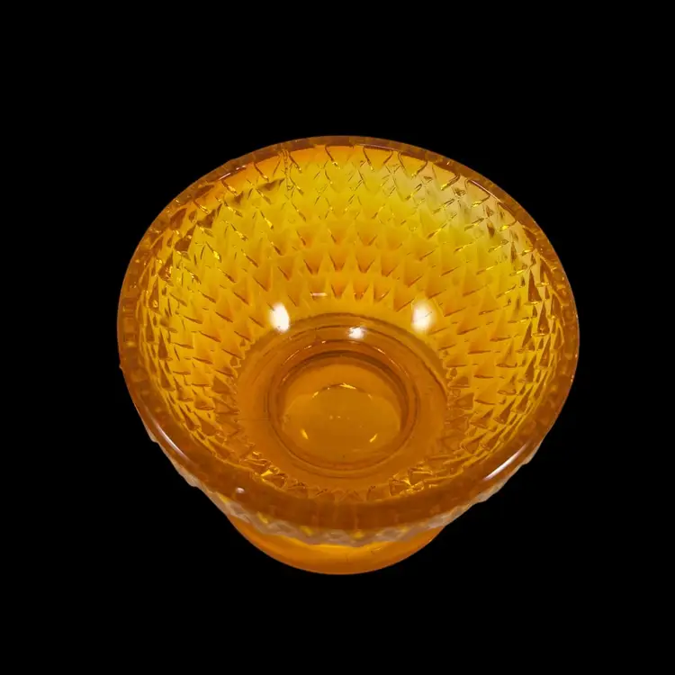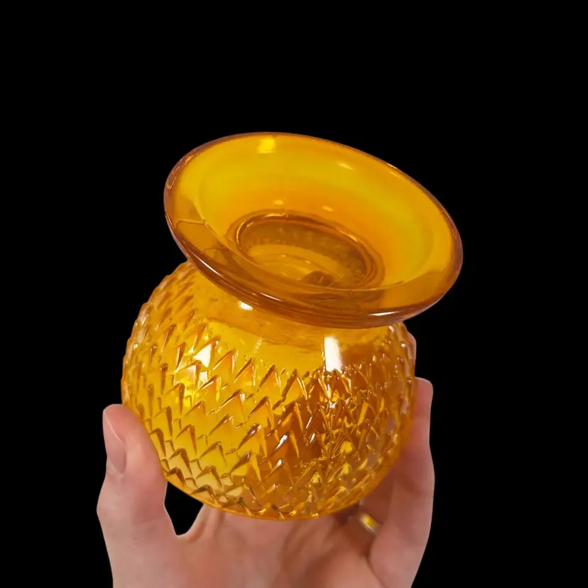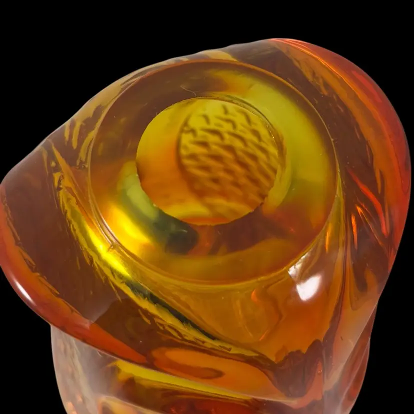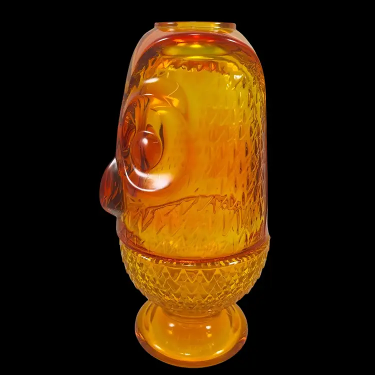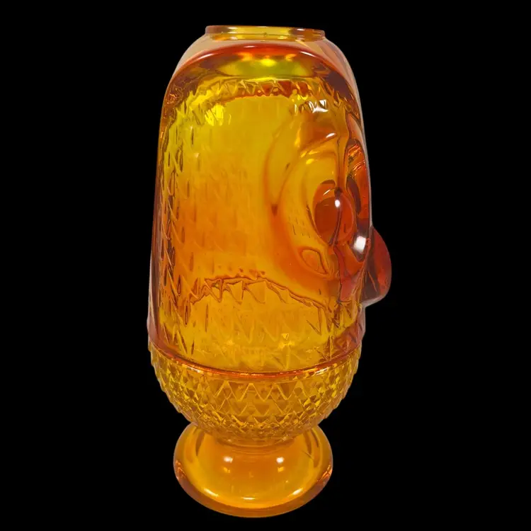Approximately 6.75” tall and 3.25” in diameter at its widest point. No chips or cracks. A few tiny flea bites around the top rim of the owl head (photo #6). Otherwise beautiful condition. Lovely cadmium glow with a UV light.