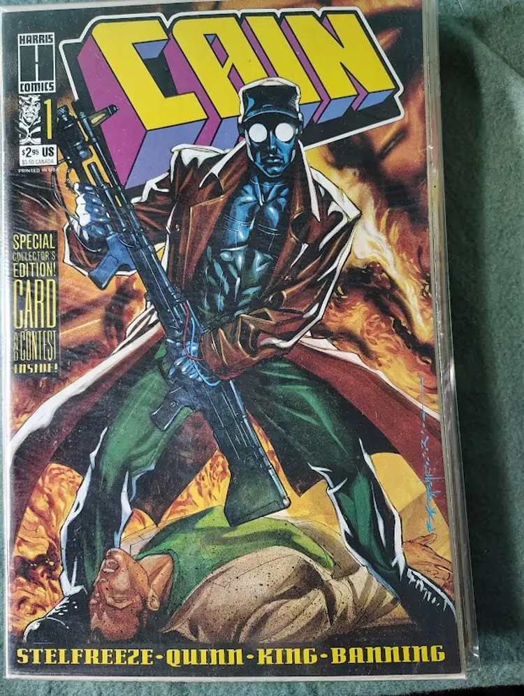 This listing features Cain issue number 1 from Harris Comics. This is the regular cover variant of the comic. The comic is noted to be in clean condition and is considered a high-value item. It includes a special collector's edition with a card and contest inside. SKU: 12MAIN6-009