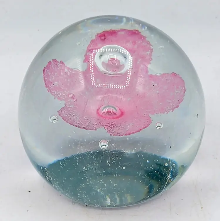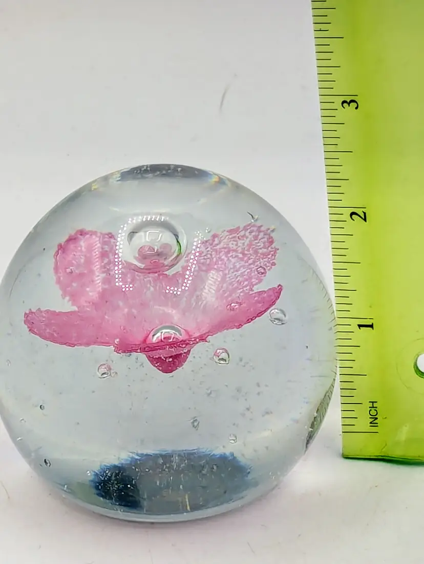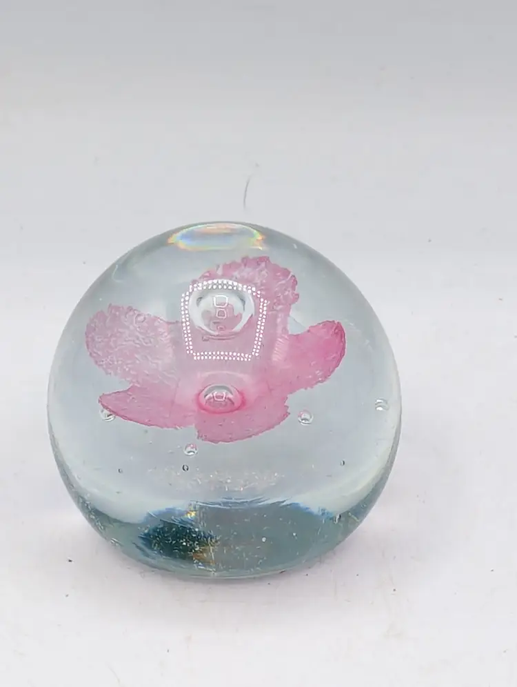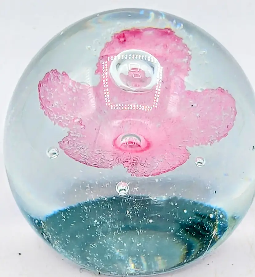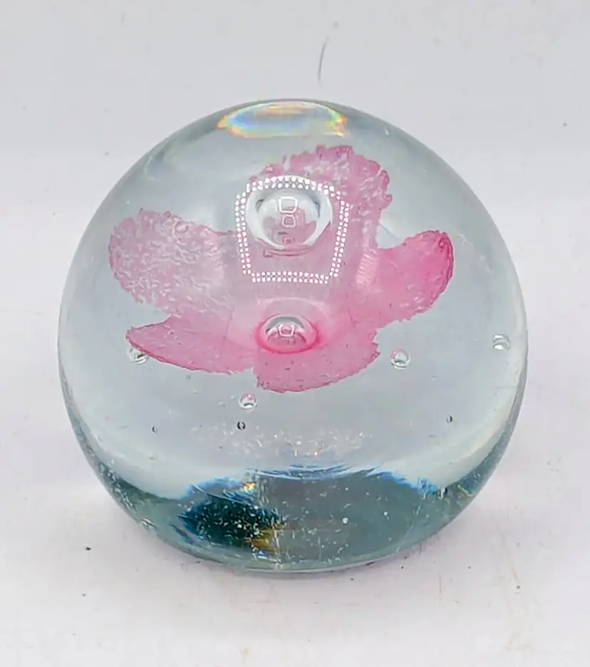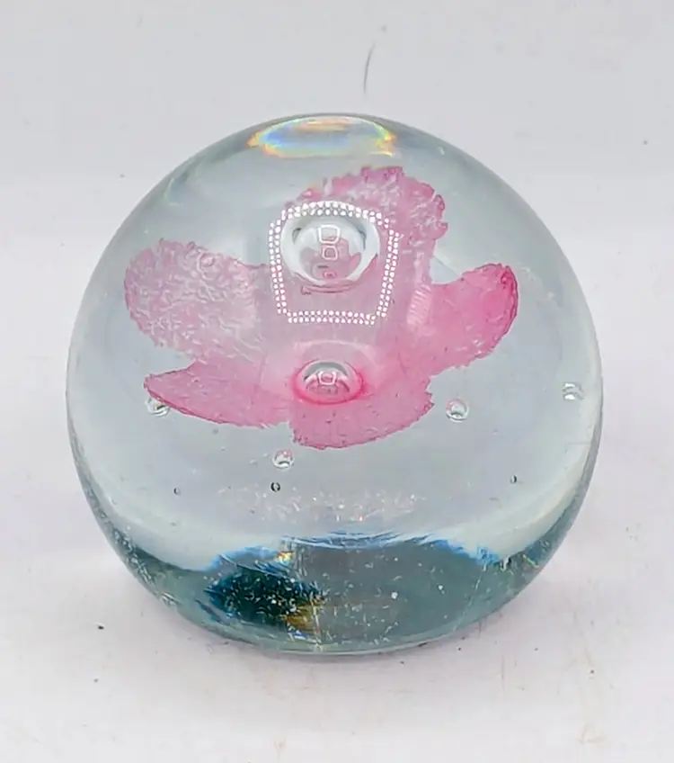 This beautiful paperweight from Caithness Scotland blown Glass features a delicate flower design, captured through the controlled bubble technique.