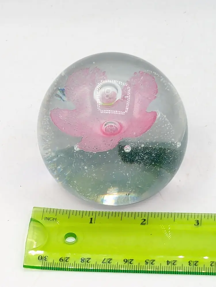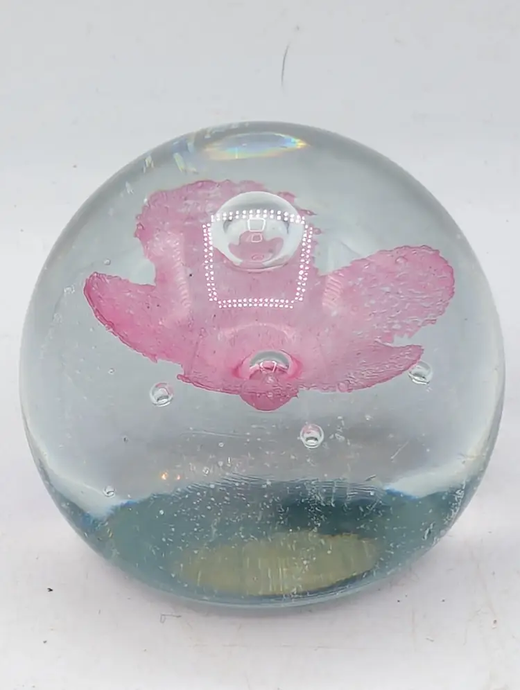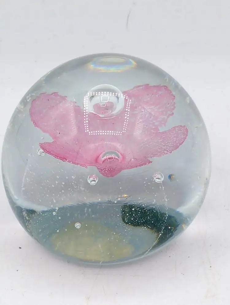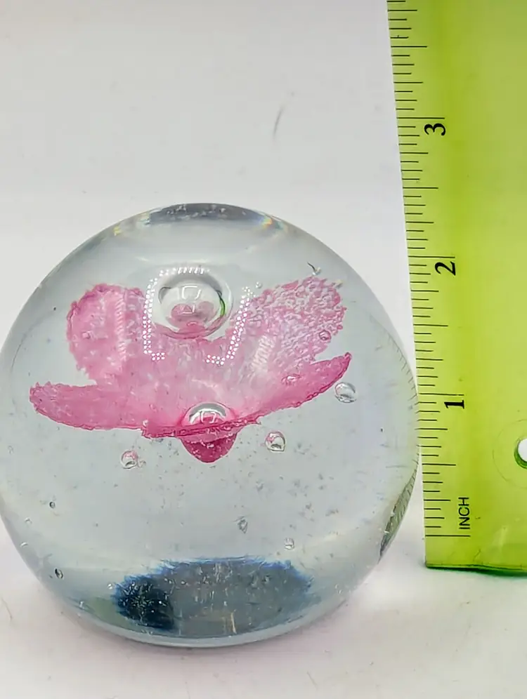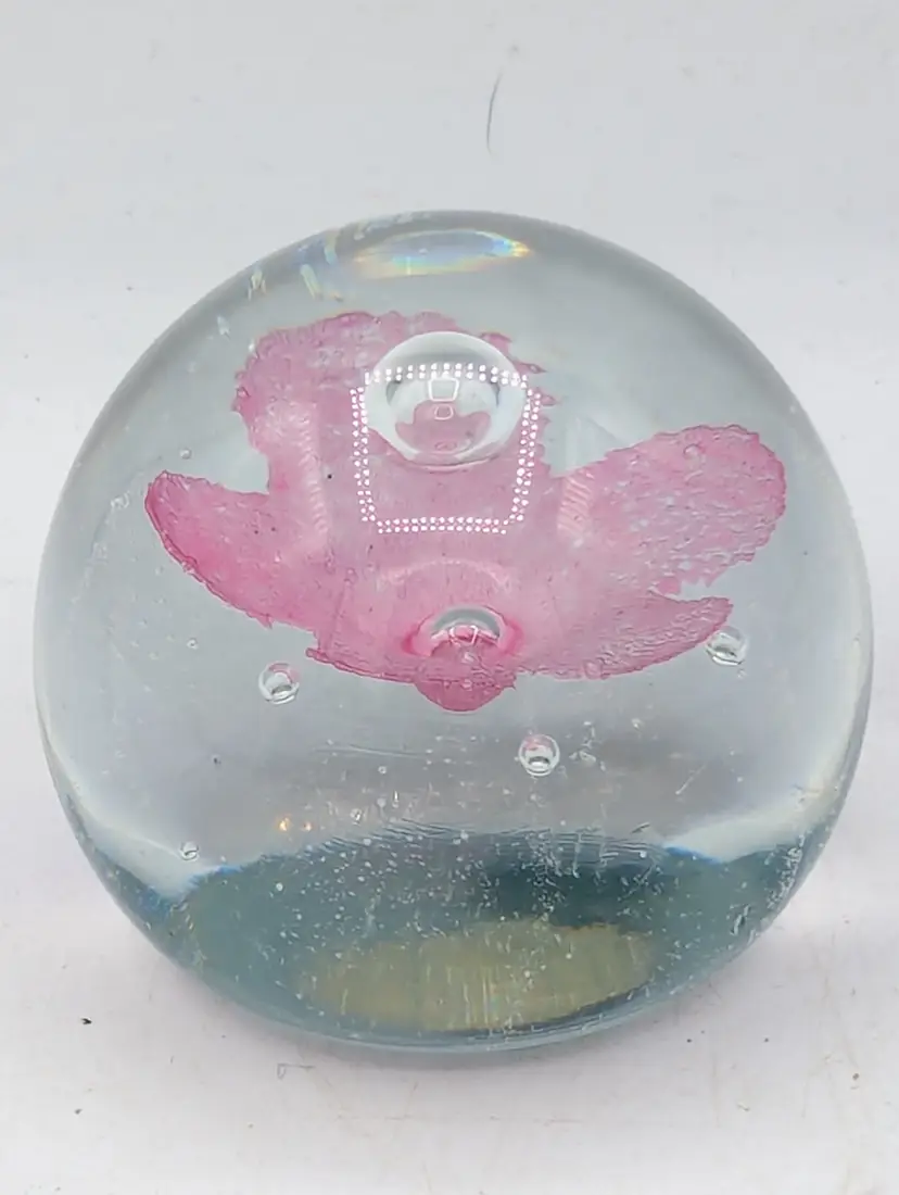 This beautiful paperweight from Caithness Scotland blown Glass features a delicate flower design, captured through the controlled bubble technique.