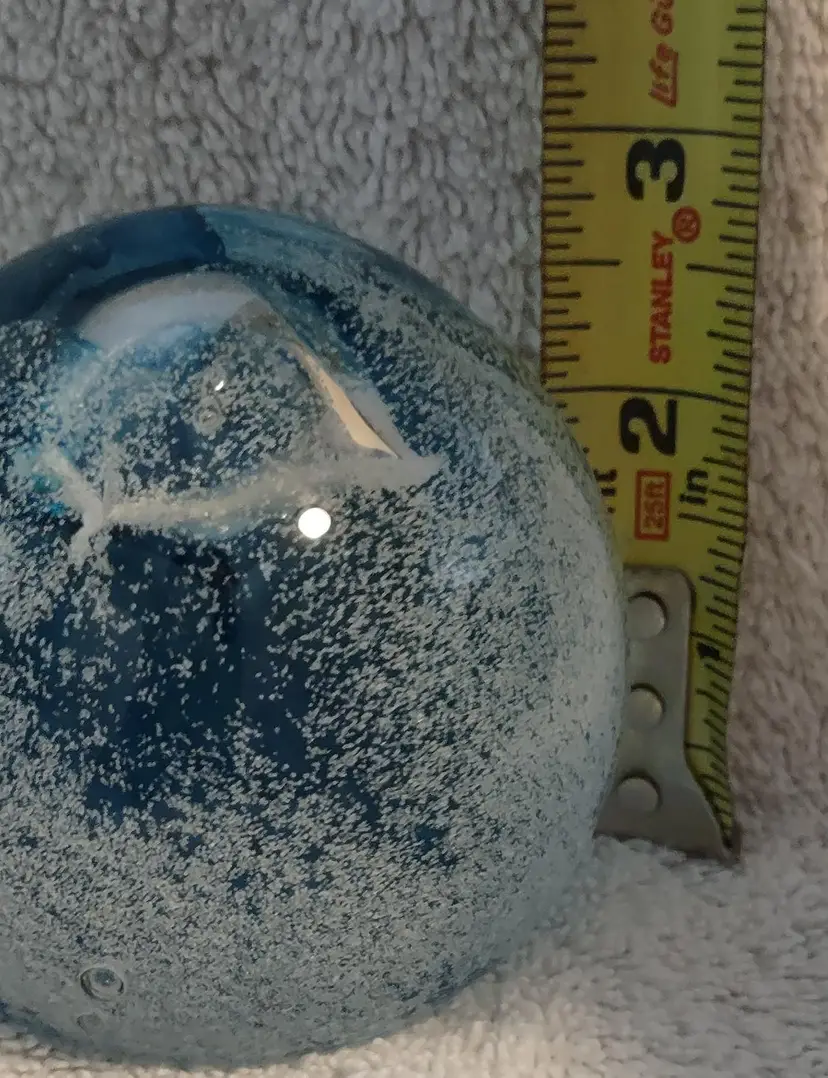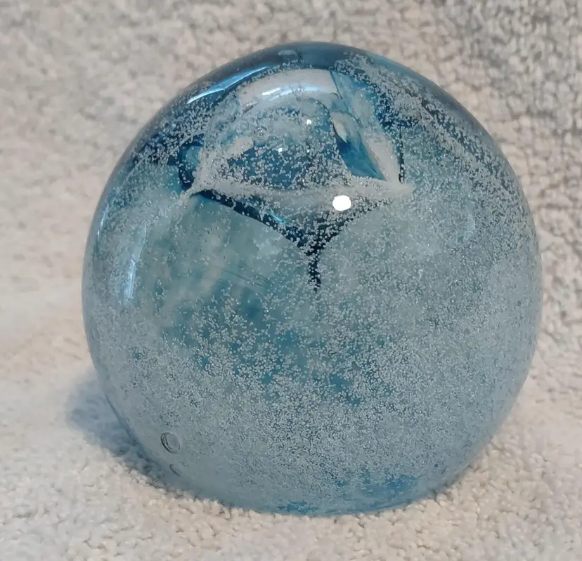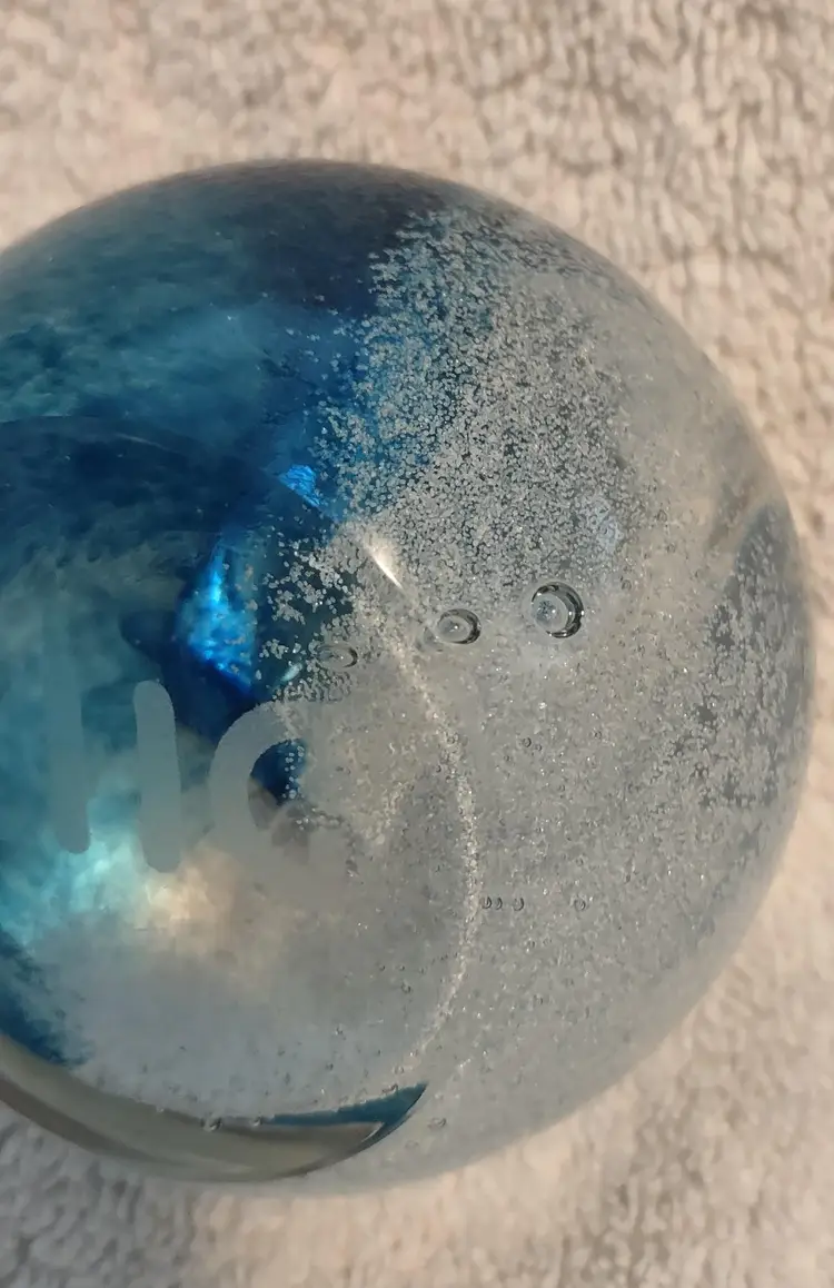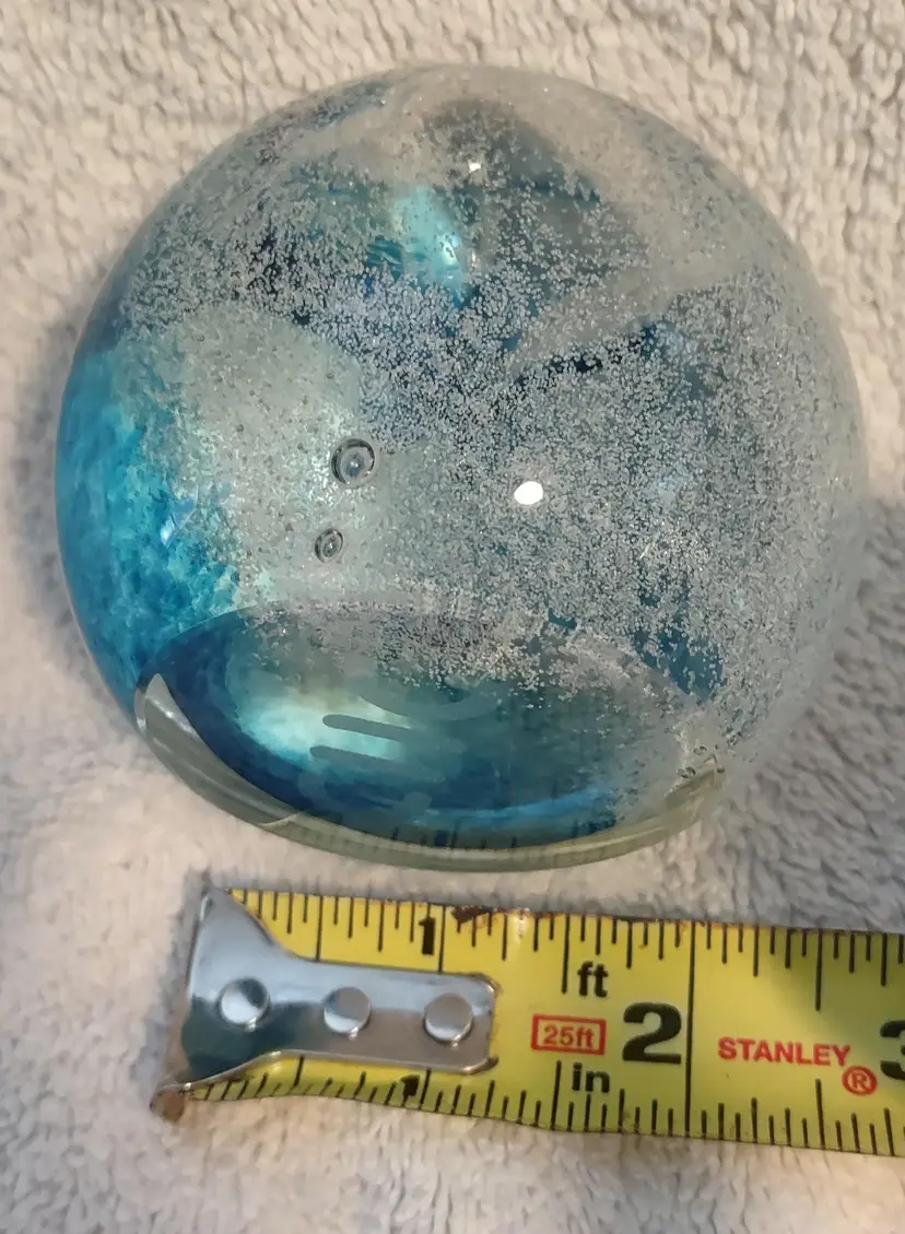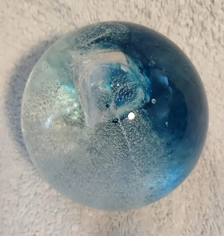Beautiful glass paperweight with blue and white colors, splash design in the top. Light scratches on the bottom