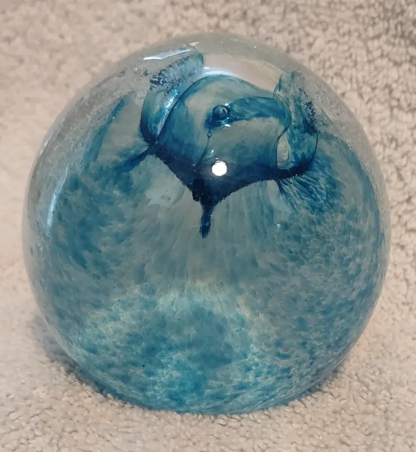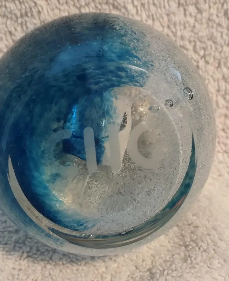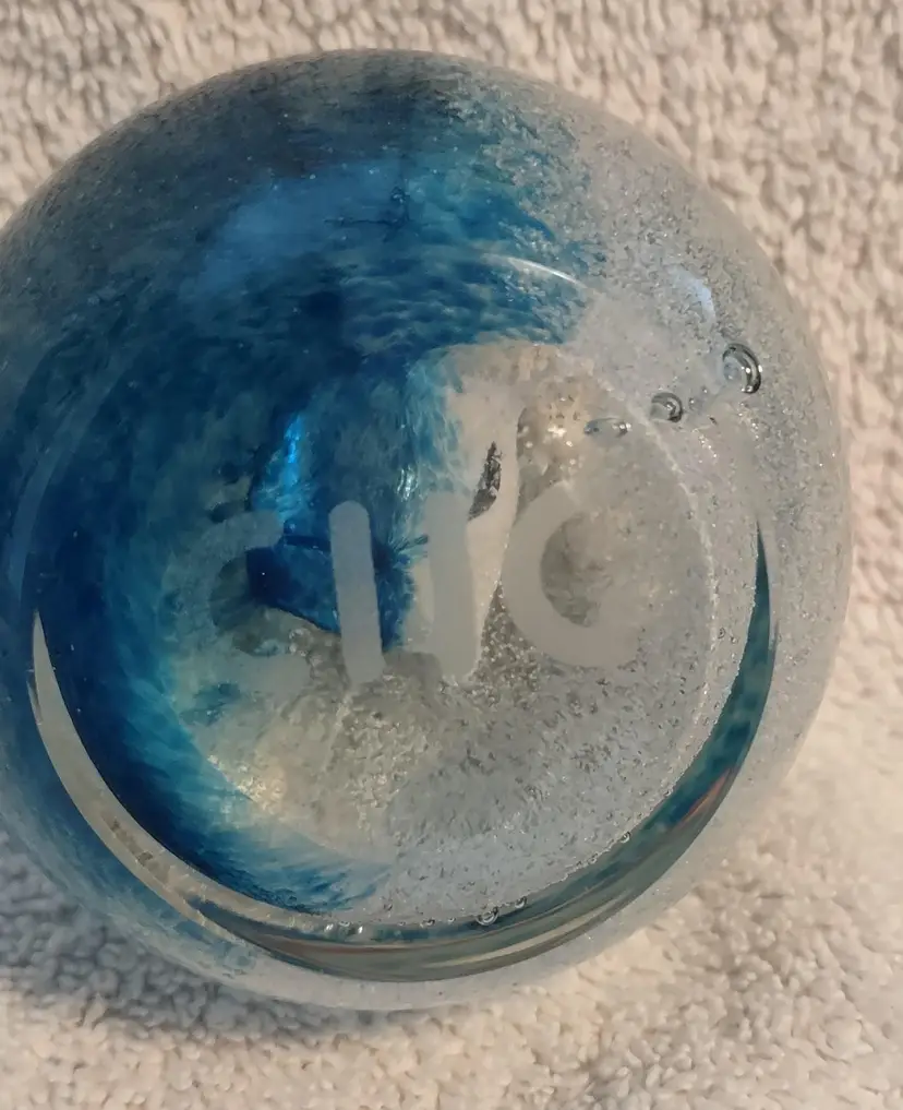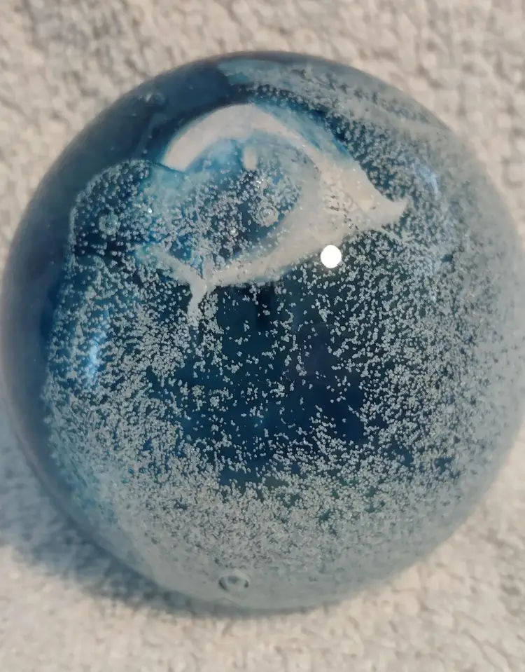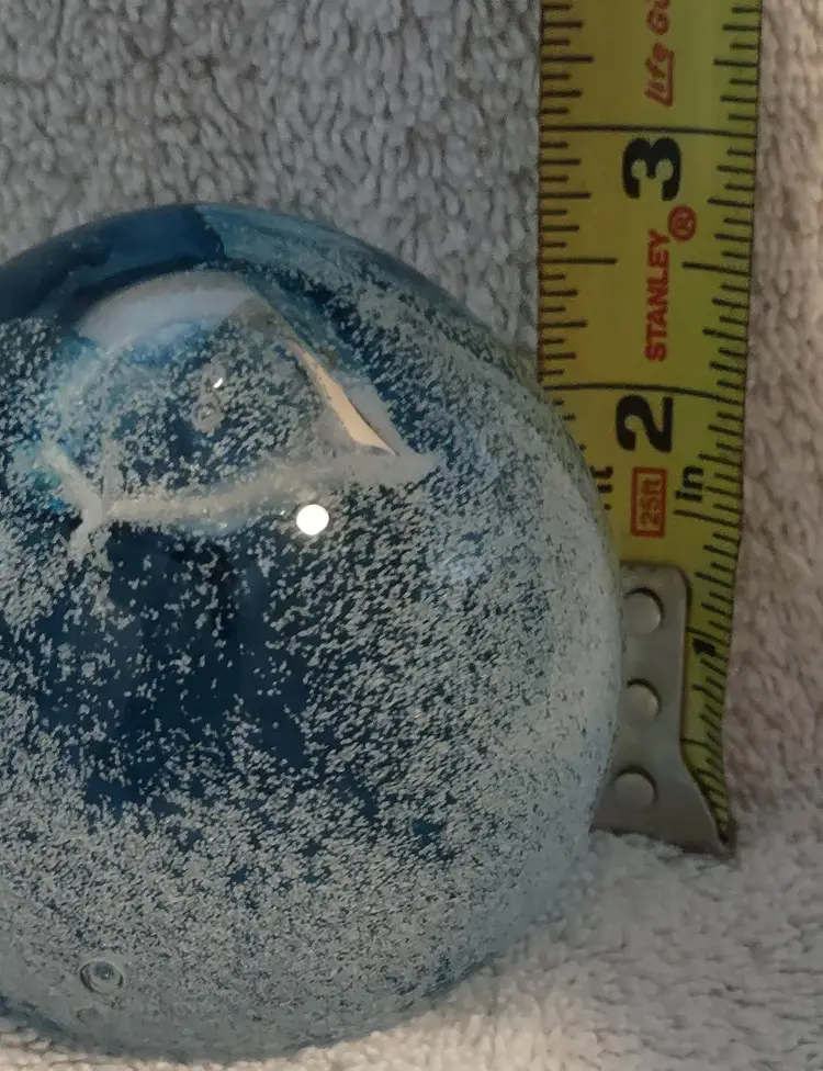 Beautiful glass paperweight with blue and white colors, splash design in the top. Light scratches on the bottom