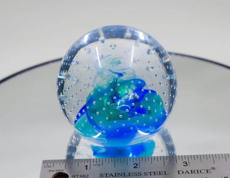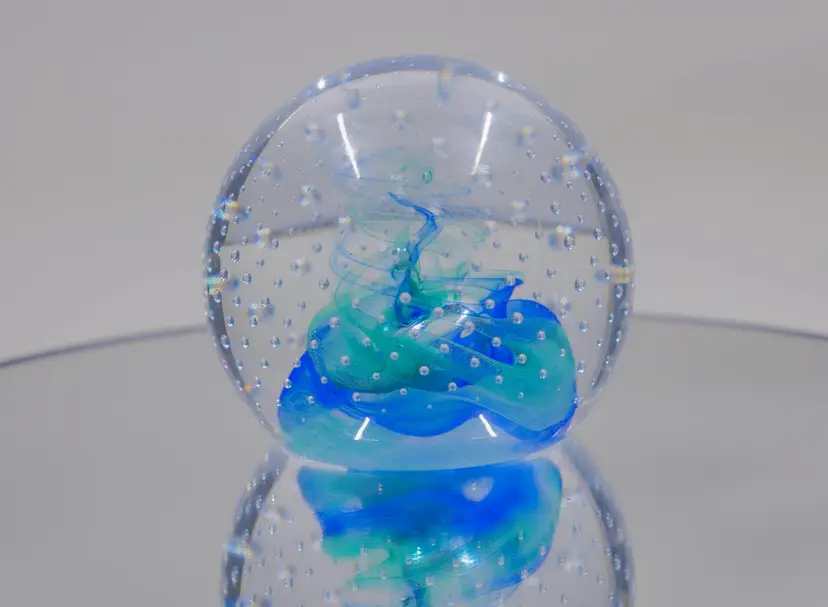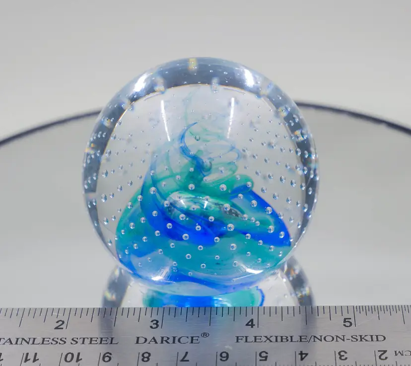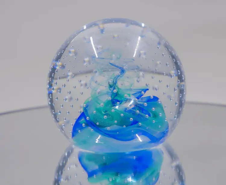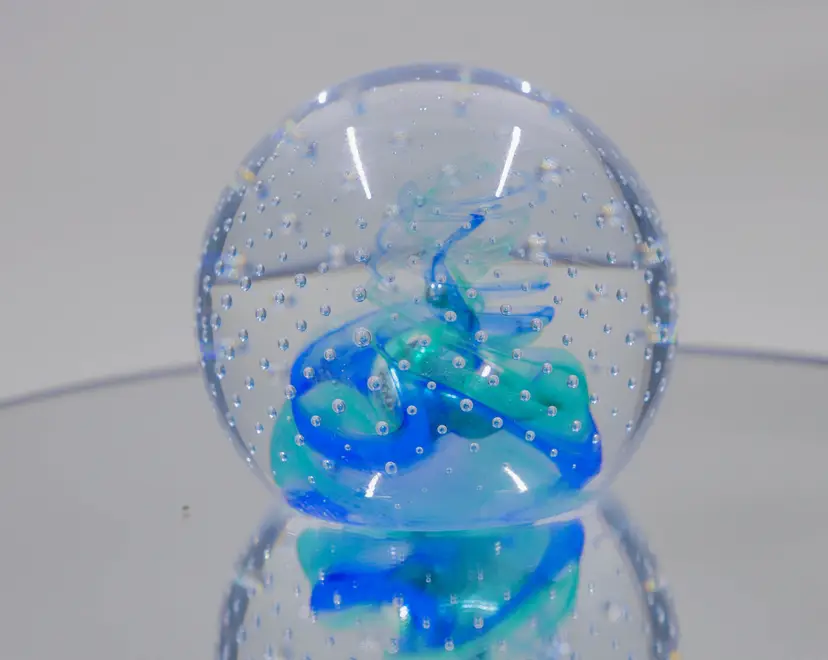 A 2"x2.5" solid, flattened dome shape Caithness art glass paperweight. The interior features a vibrant, swirling design of ribbons in blue and teal, with an outer layer of clear glass containing a series of controlled bubbles. The base is stamped with "Caithness Scotland Reflections Collectors Club 93." The company's "Reflections" series was exclusively available to members of its Collectors Club, which was established in 1976. These pieces were often produced as complimentary gifts or special purchase opportunities for members, making them a specific type of collectible sought after by enthusiasts of the brand.