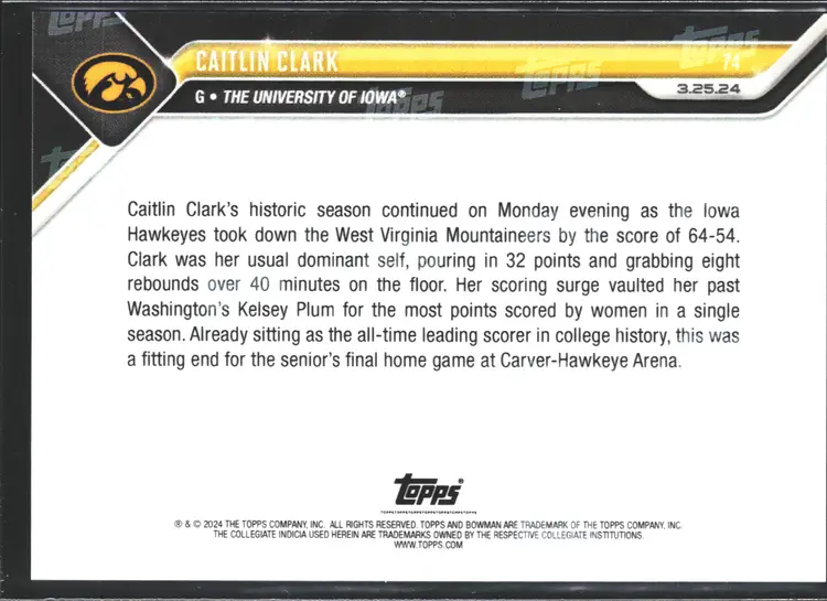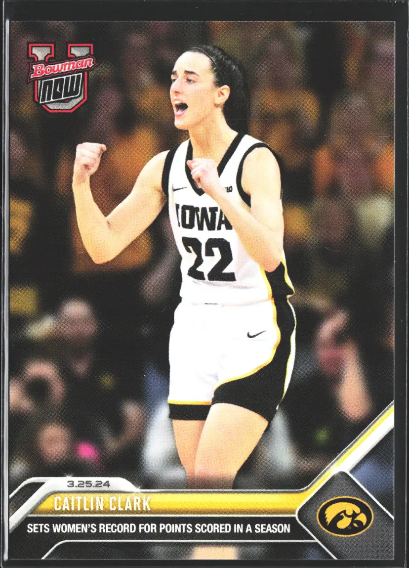 1st time buyer? Get $5 Off with code DISTRICT5 at checkout! Card as shown. All cards $20 and under ship PWE via lettertrackpro [https://www.letter-track.com/registerap.asp?AFID=8757] Card Size: Standard Autographed: No League: National Collegiate Athletic Association (NCAA) Set: 2023-24 Bowman U Now Print Run: 26212 Year Manufactured: 2024 Player/Athlete: Caitlin Clark Original/Licensed Reprint: Original Vintage: No Type: Sports Trading Card Sport: Basketball Language: English Card Name: Caitlin Clark Autograph Authentication: Score Manufacturer: Topps Features: Base Set, Limited Edition, Rookie Team: Iowa Hawkeyes Card Number: 74 Country/Region of Manufacture: United States Season: 2023-24
