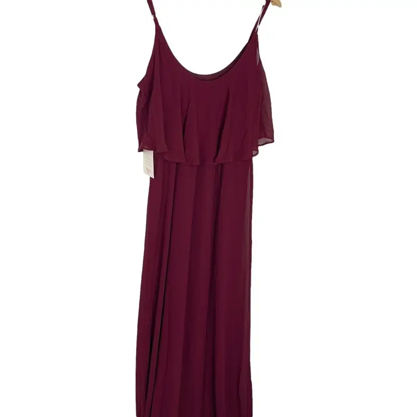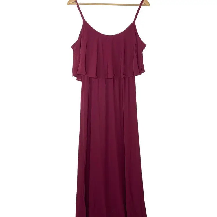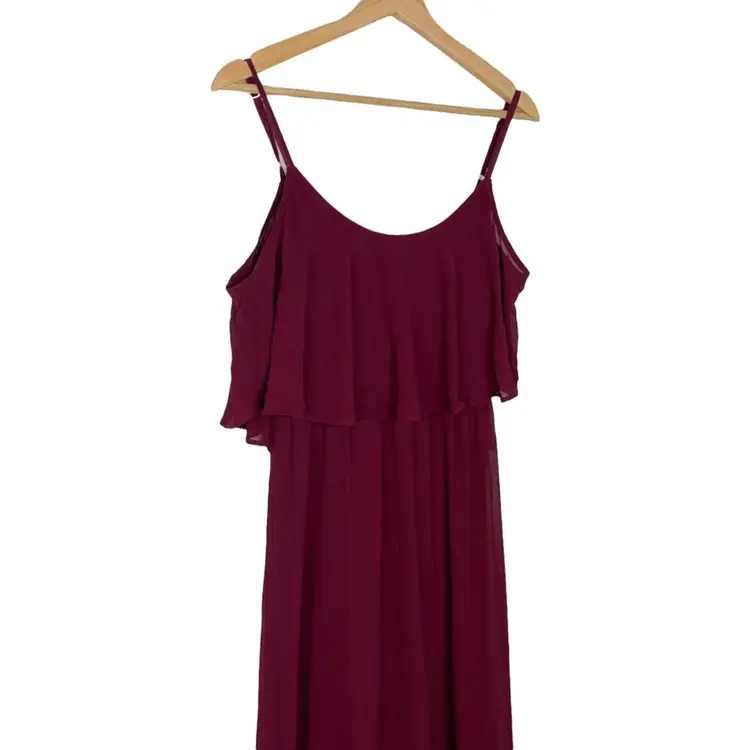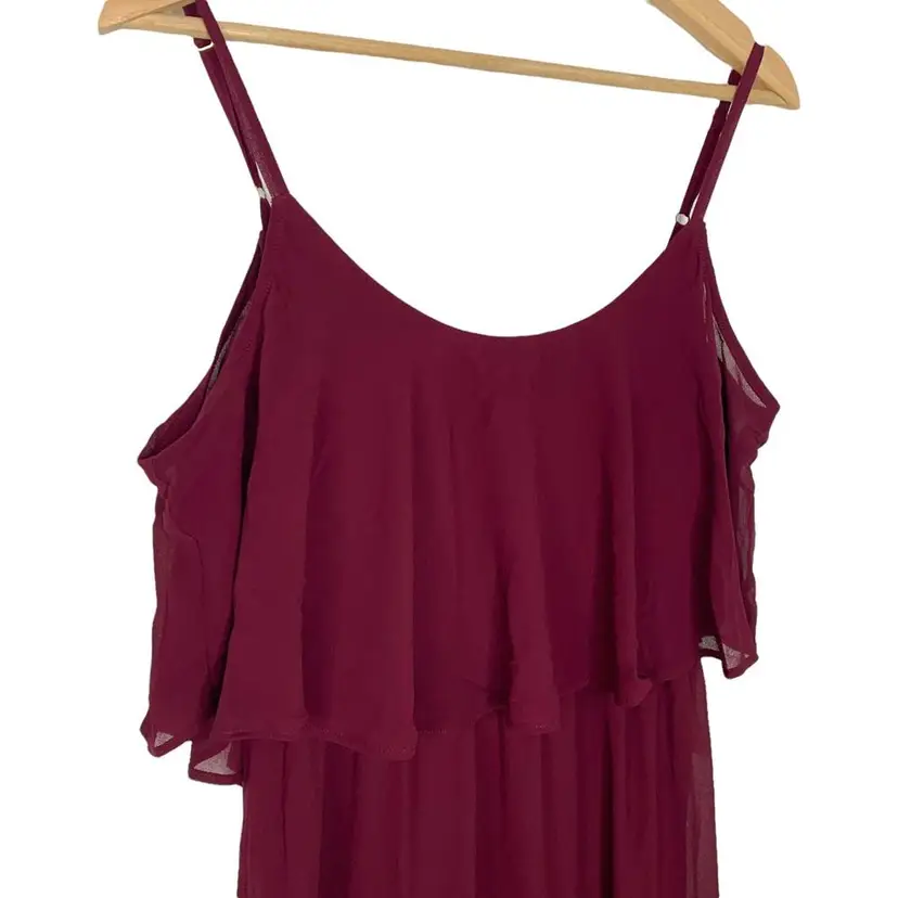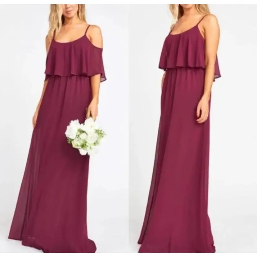 Show Me Your Mumu Burgundy Caitlin Ruffle Maxi Dress A bridesmaid dress, excellent condition new with tags Medium Flows from top to bottom. wear her as a classic spaghetti strap or make her into a cold shoulder! *Chiffon - 100% Polyester *Lined to the ground *No slits *Adjustable straps *Wear ruffle over your shoulders or take arms out for a simple silhouette *Strapless bra friendly *Hidden elastic waist