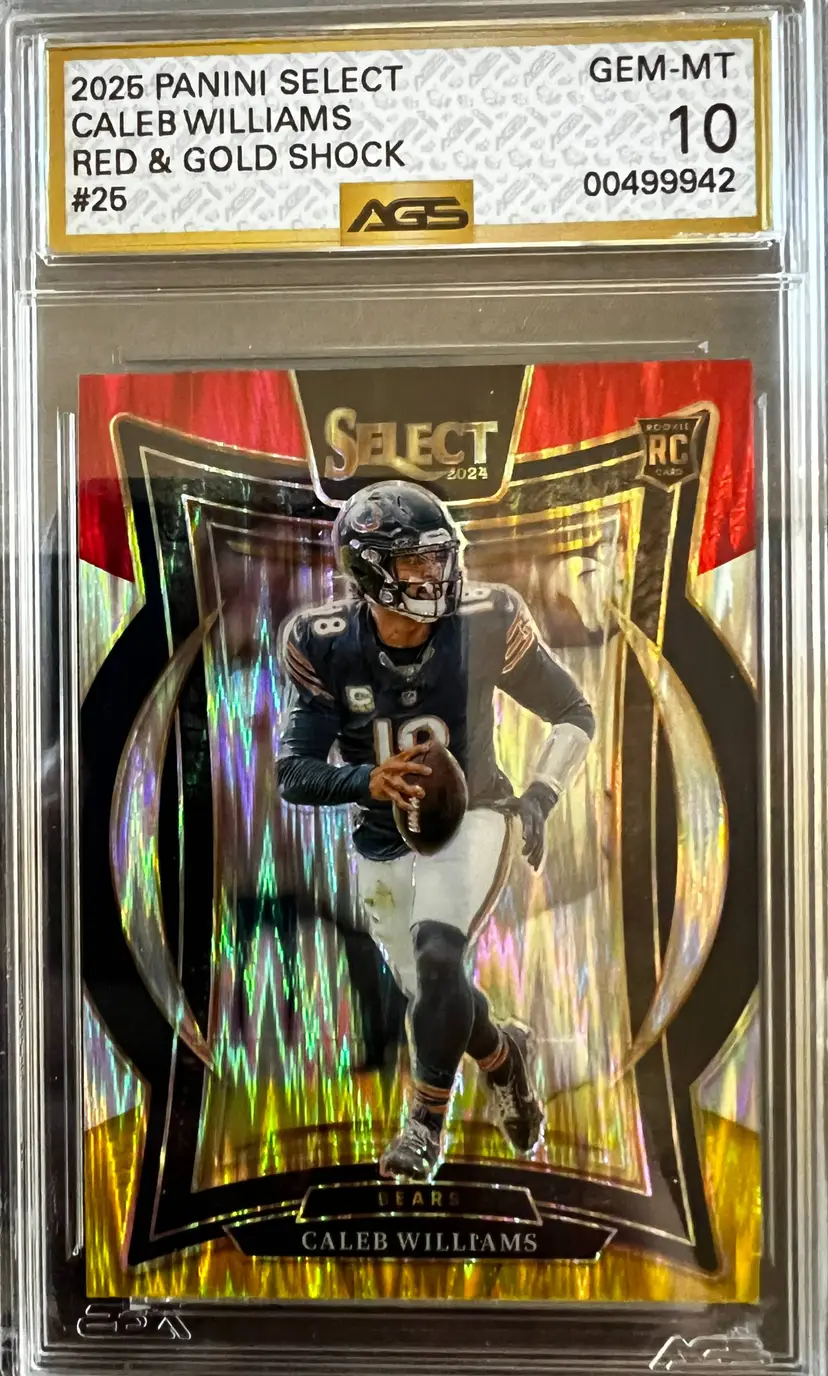 Snag this Caleb Williams Red & Gold Shock card from the 2025 Panini Select series. A gem for any football fan or card collector.