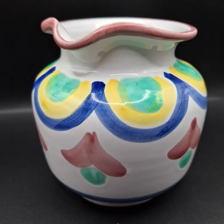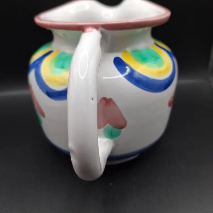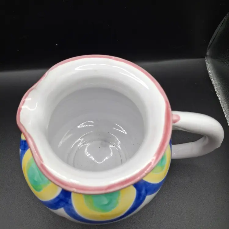 4 x 3 inches • Hand-painted design with vibrant colors • Sturdy handle for easy pouring • Elegant curved spout • Durable ceramic construction • Unique artistic piece