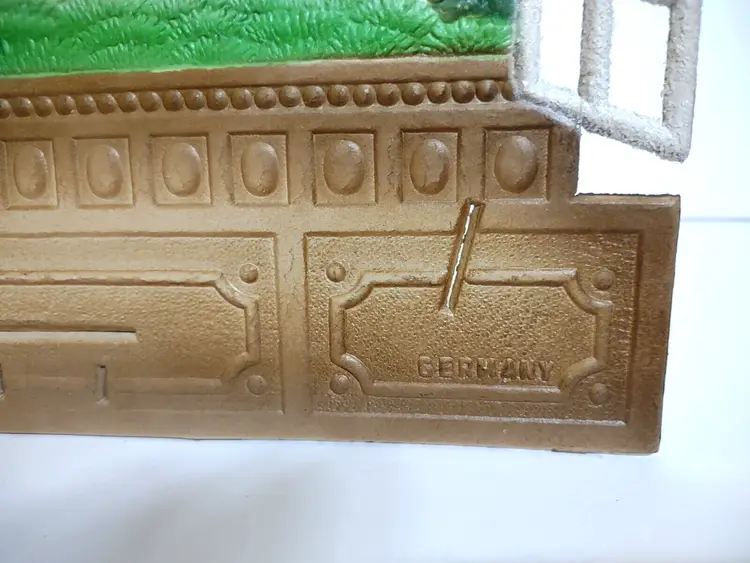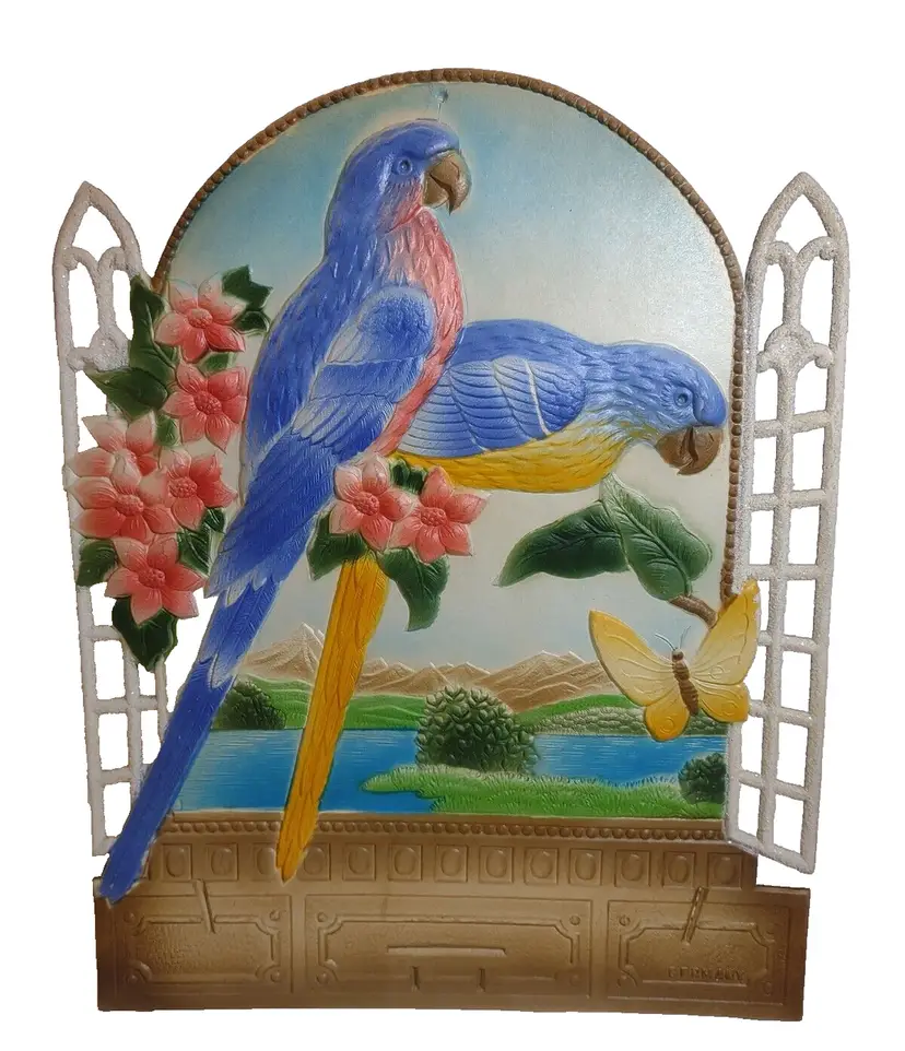 UNUSED old stock vintage German made thick pressed cardboard embossed die-cut calendar top. Never displayed. Excellent unused condition. Has glitter accents with a great colorful 3-D look. Marked Germany.