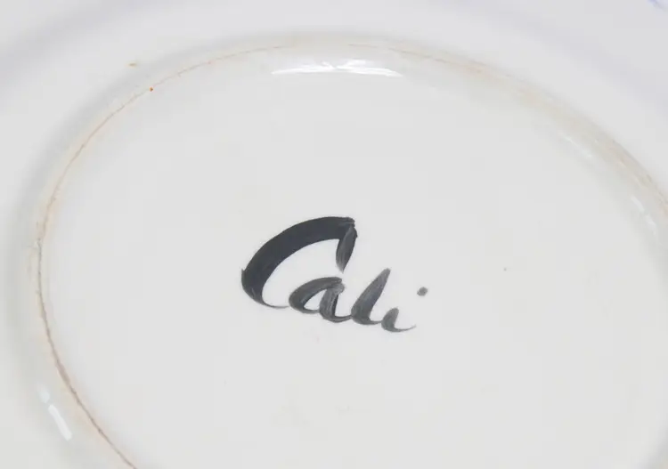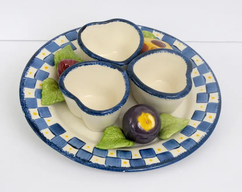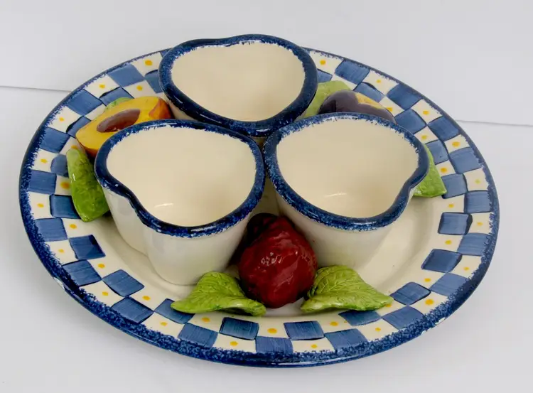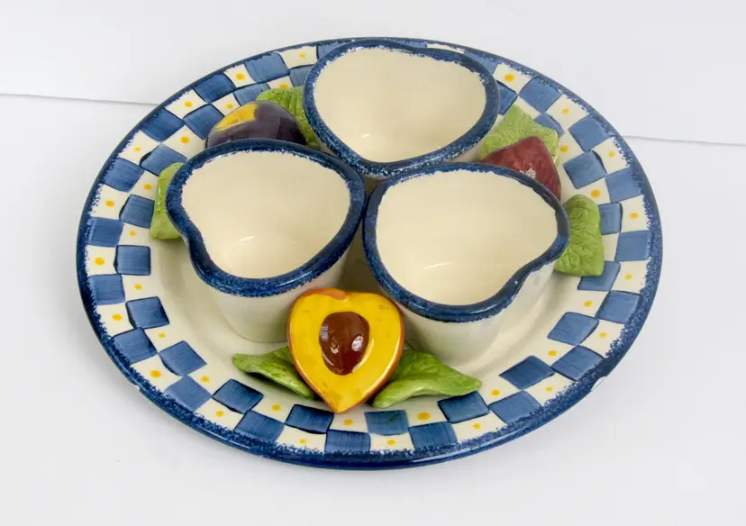 This ceramic serving plate/platter from Cali features attached heart-shaped cups for condiments or sauces, attached ceramic stone fruit and a blue and white checked rim.