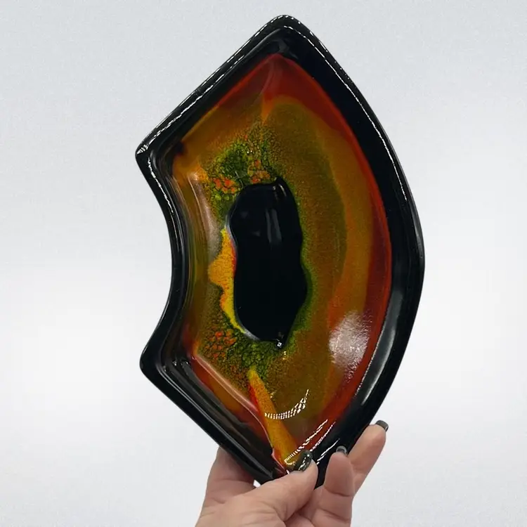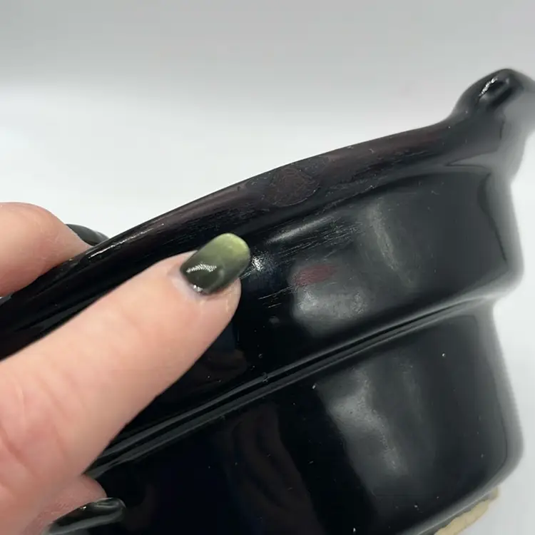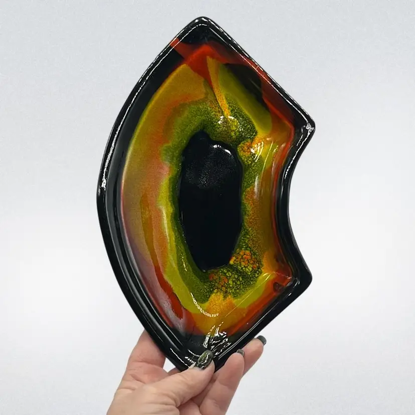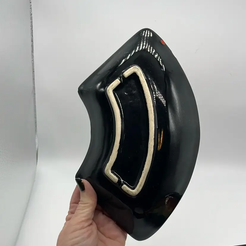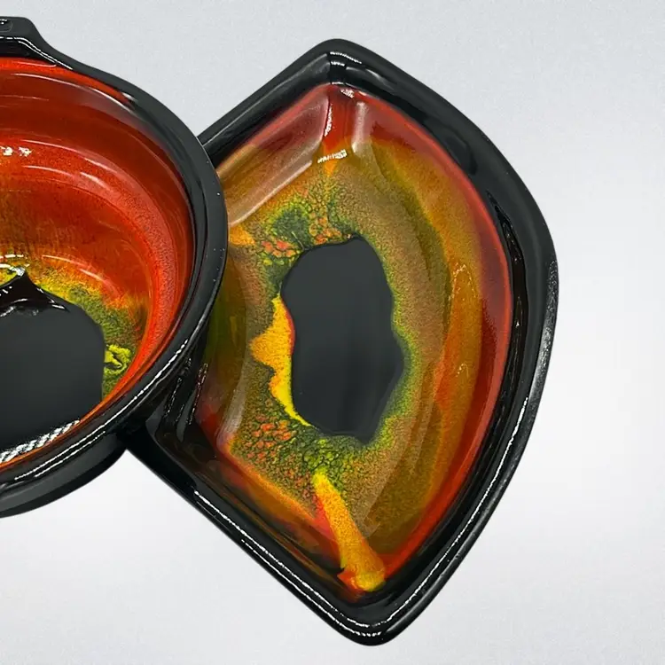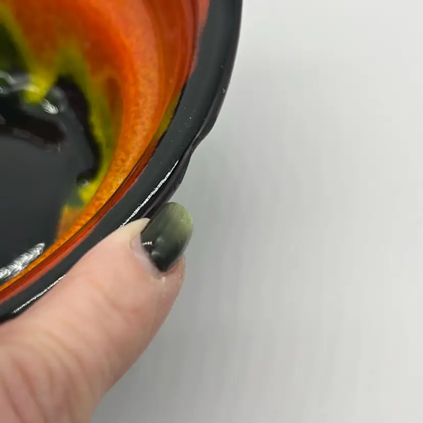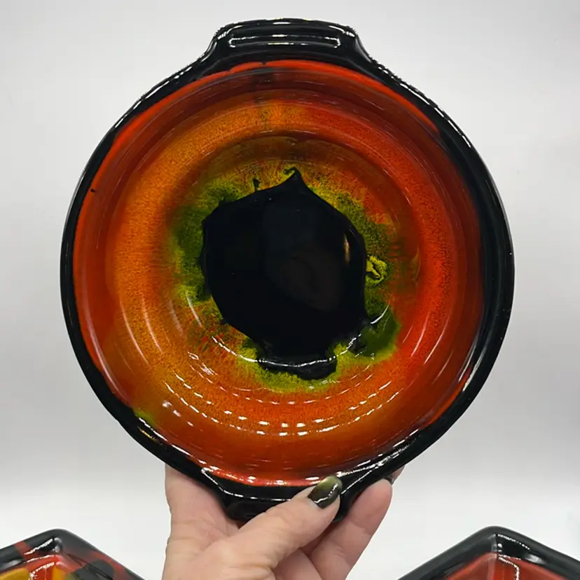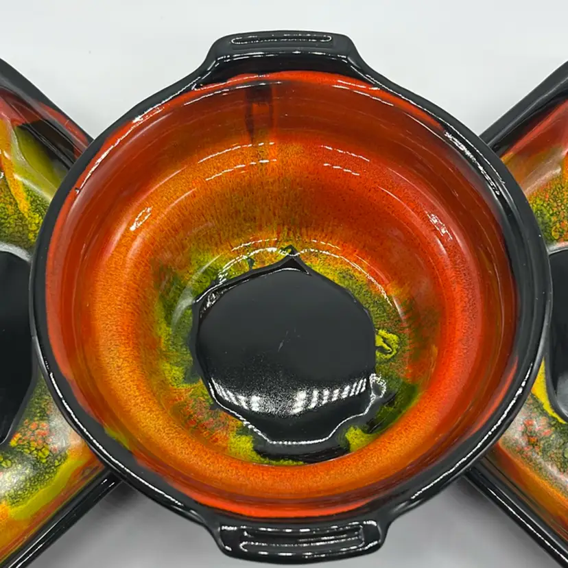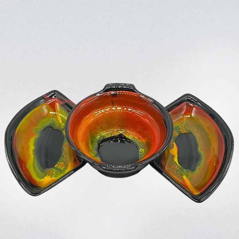 Absolutely Stunning!!! Unfortunately only 3 pieces but they display beautifully!! Marked USA on bottoms. One outer bowl has minor chip, center bowl as well, and flea bites. (repaired well with black, see pics) No other chips or cracks. Will ship alone. Approx: 15” Across Bowl: 7.5” d x 3.25” h Outer dish: 5”w x 9.25” L x 1.5” h