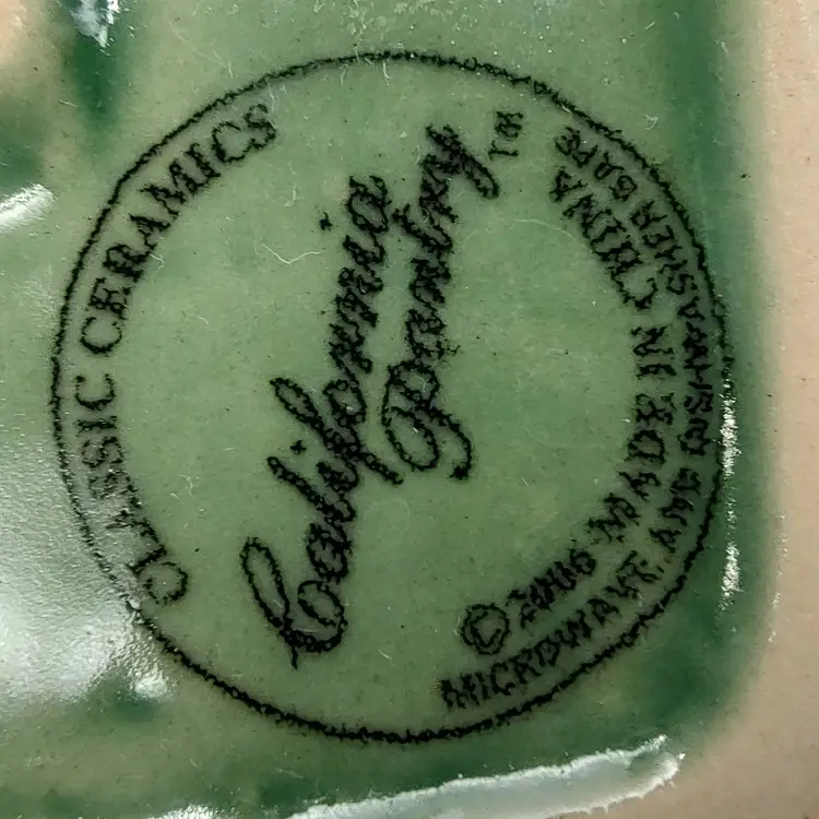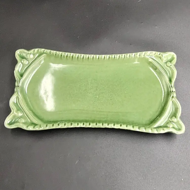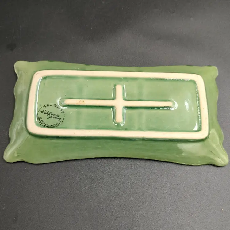 California Pottery 2007 Classic Ceramics Green Relish Dish. Height 0.5" x width 4" x length 8". Made in China