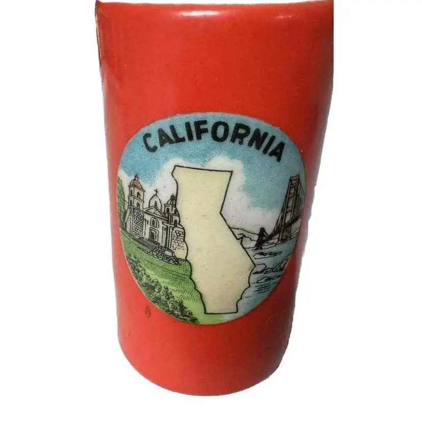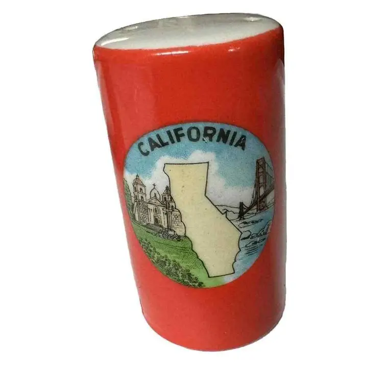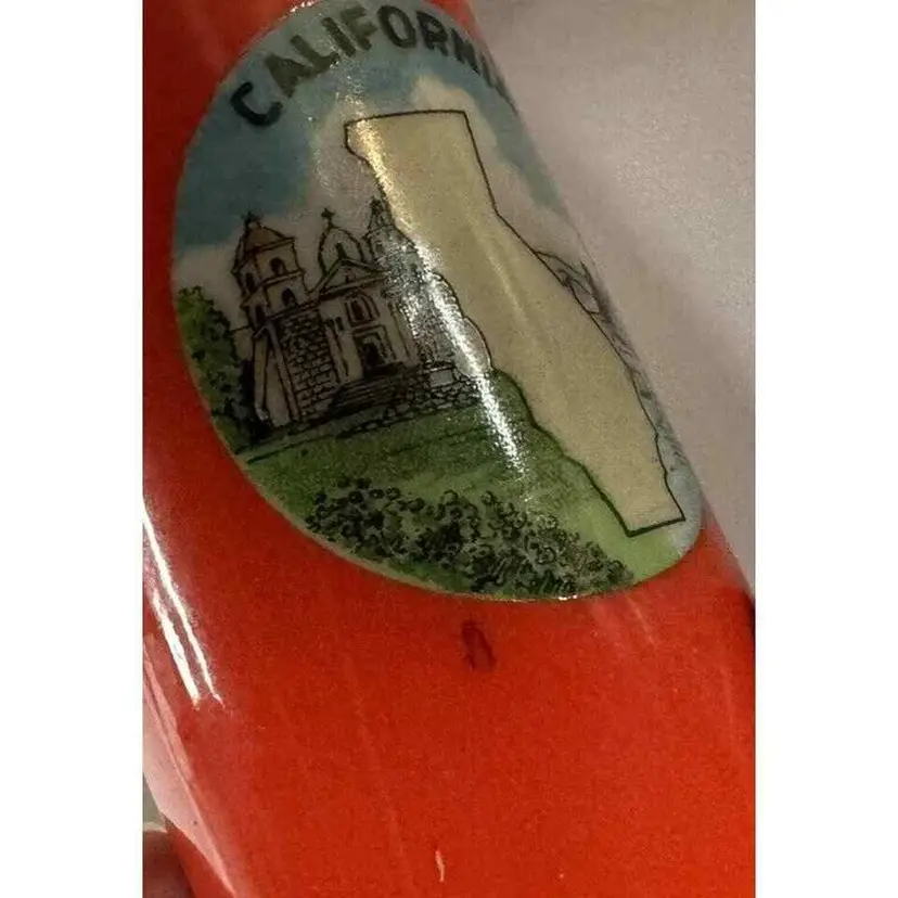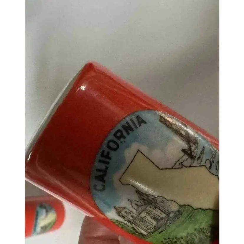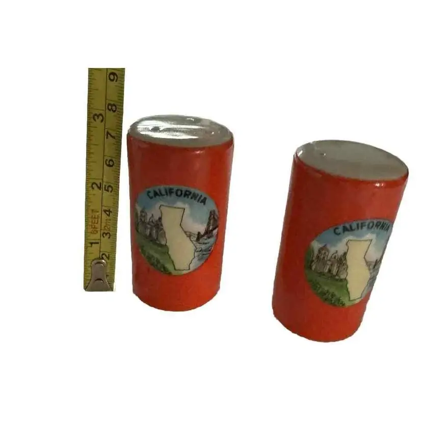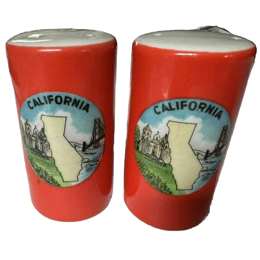 Add a vintage touch to your kitchen with these California Souvenir Salt and Pepper Shakers. Made in Japan, these ceramic shakers come in a set of 2 with a red color and original design. Perfect for collectors or those who appreciate unique kitchen tools, this set includes a pepper shaker and a salt shaker. Please see pictures for details on marks on items.