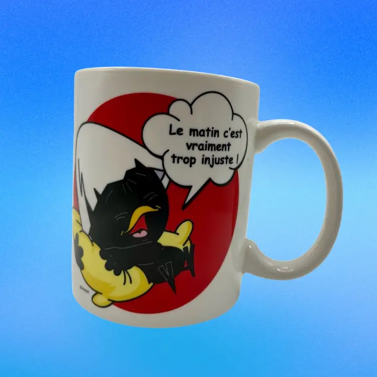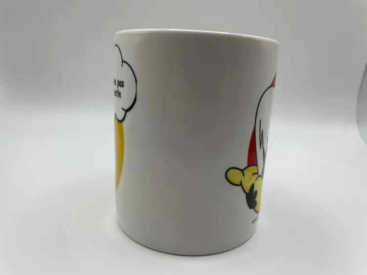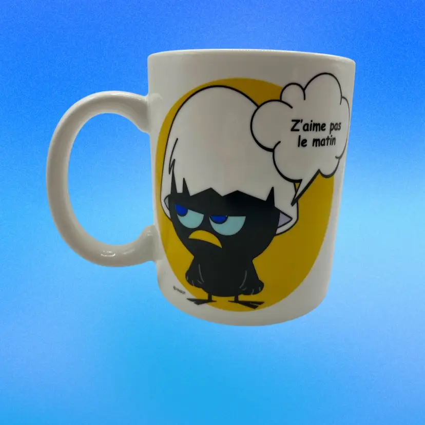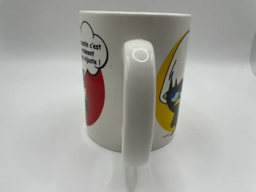 The Calimero MUG Collectible by Pagot is a highly sought-after ceramic coffee mug (especially in the US) featuring the beloved cartoon bird character Calimero in French language text. This multicolored mug is a must-have for fans of the Calimero franchise and collectors of animation merchandise. The design combines the charm of cartoon characters with the functionality of a coffee mug, making it a unique and whimsical addition to any collection.