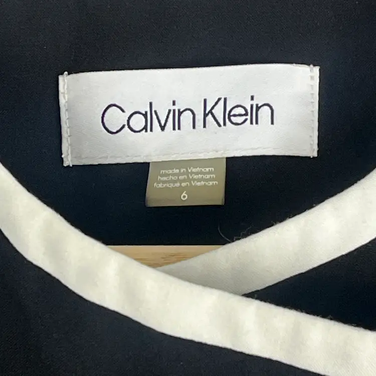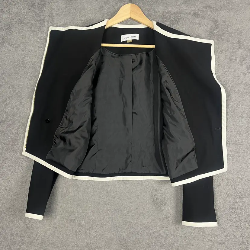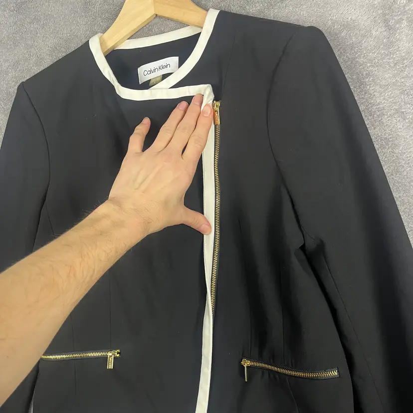 A sleek Calvin Klein blazer designed to elevate everyday outfits with minimal effort. This black tailored jacket features crisp white contrast trim, a modern asymmetrical front, and gold-tone zip pockets for a polished yet contemporary look. Fully lined with light structure and a touch of stretch for comfort and ease of movement.
