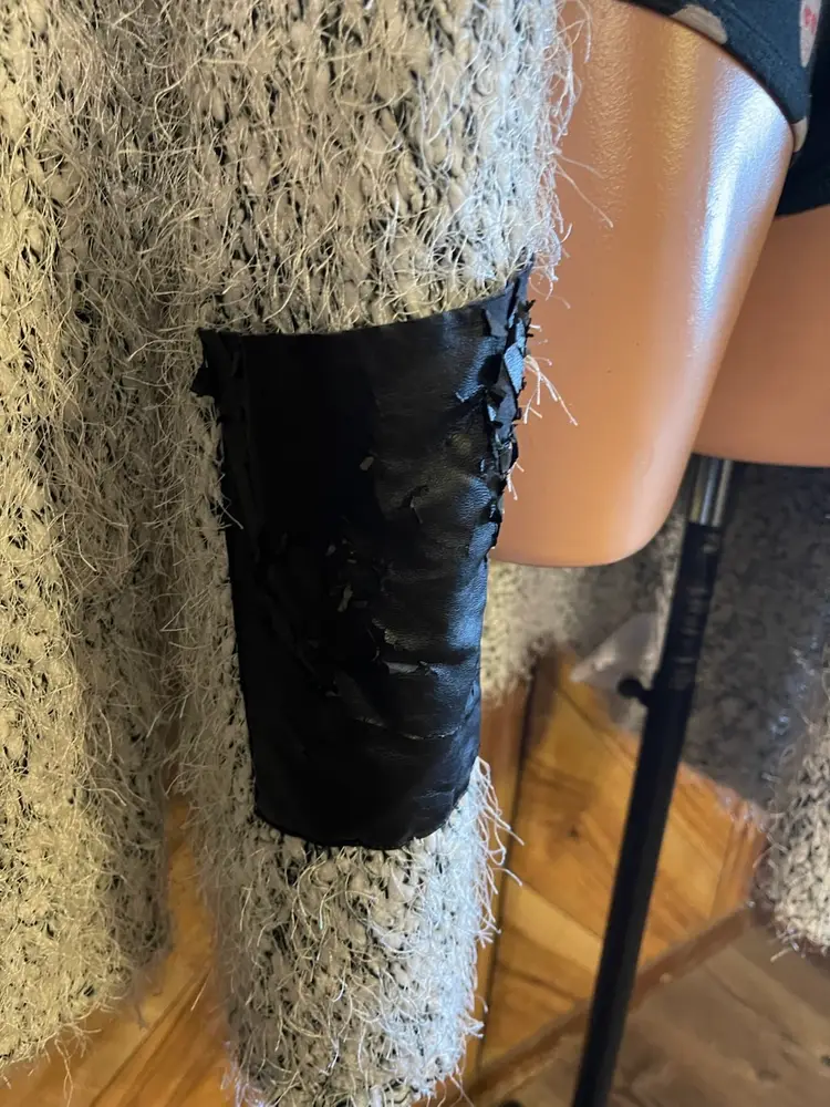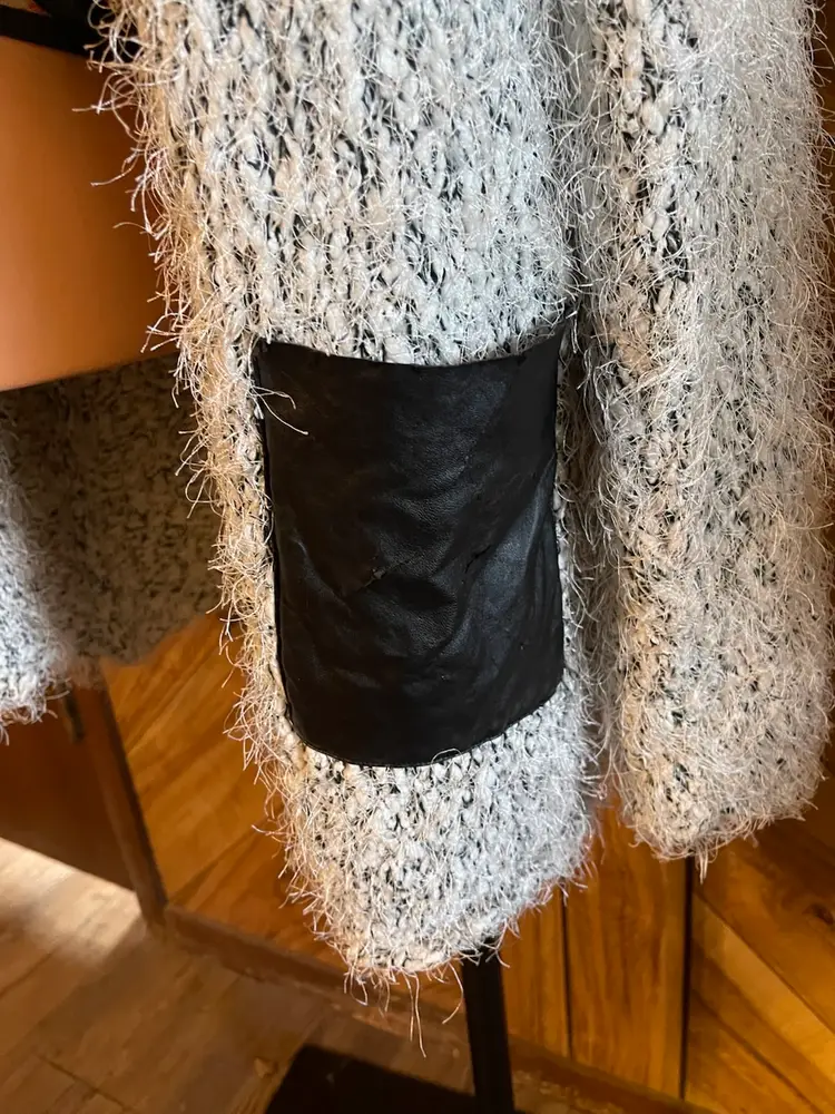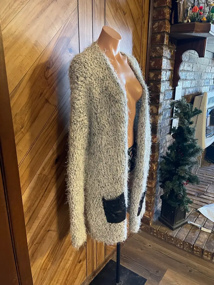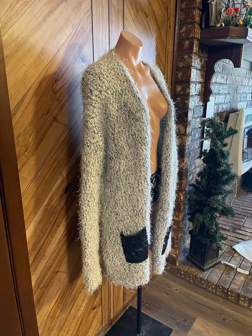 While the body of the sweater is in excellent shape, please note the flaw: the faux leather trim on the front pockets is peeling (see photos). This is a great opportunity for a DIY fix, a creative patch, or simply removing the trim for a custom look! Even with the wear on the pockets, the cardigan remains incredibly soft and stylish. • Condition: Very Good Used Condition (VGUC) with noted pocket flaw • Size: Large (L) • Material: Soft, fuzzy eyelash knit • Style: Longline, open front, oversized fit