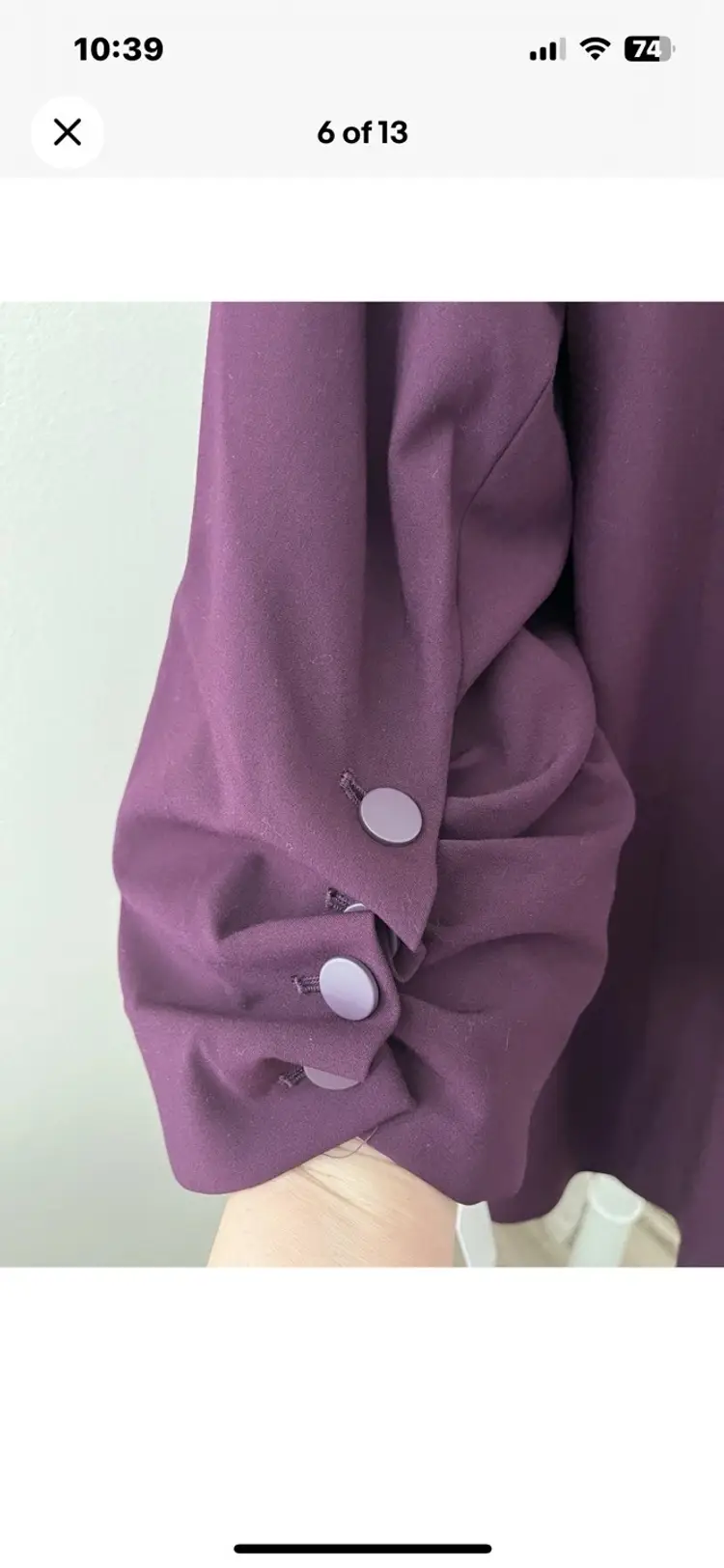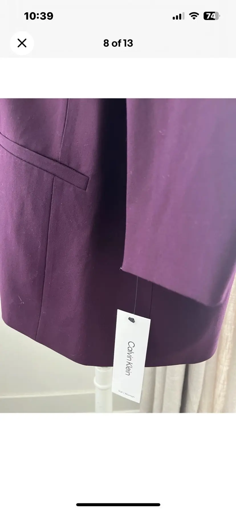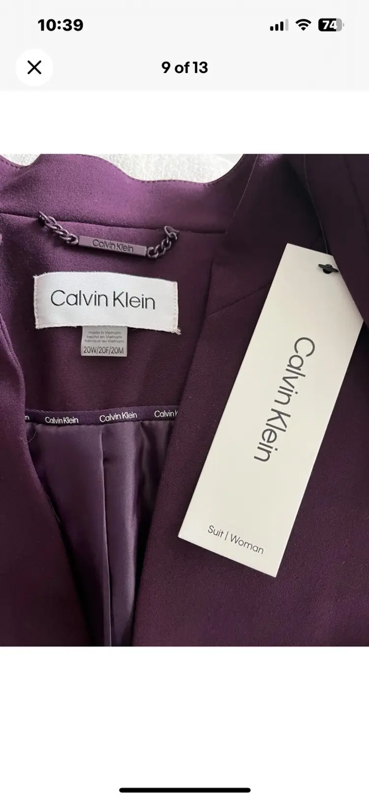New with tags, fully lined, padded shoulders, polyester, rayon, spandex. Calvin Klein Women's Lux Collarless Ruched 3/4-Sleeve Purple Blazer Size 20W NEW with tags.