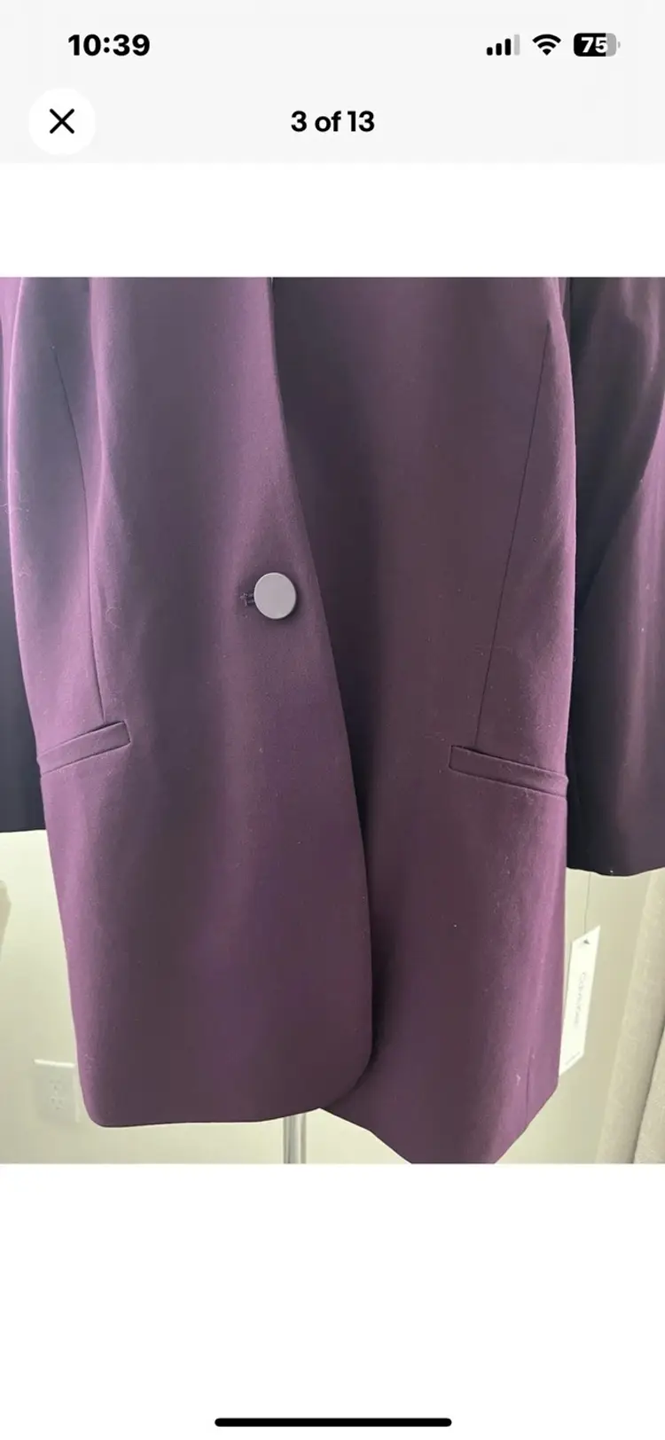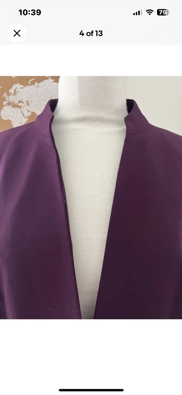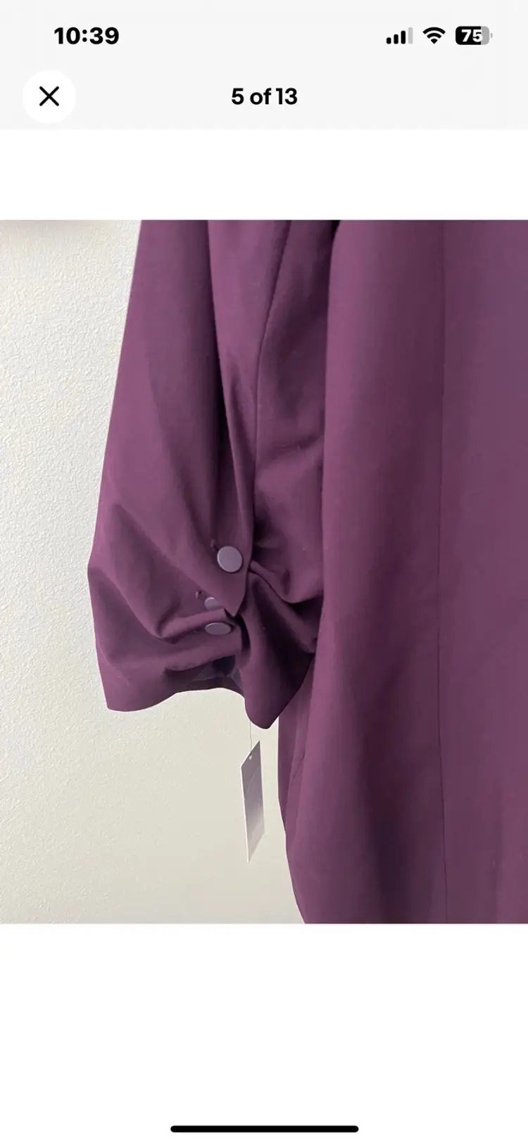 New with tags, fully lined, padded shoulders, polyester, rayon, spandex. Calvin Klein Women's Lux Collarless Ruched 3/4-Sleeve Purple Blazer Size 20W NEW with tags.