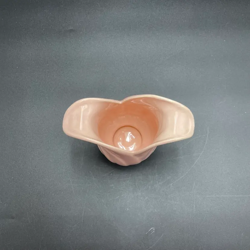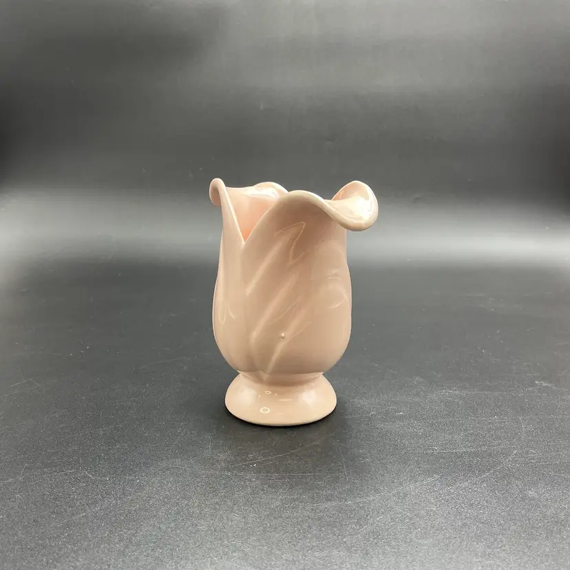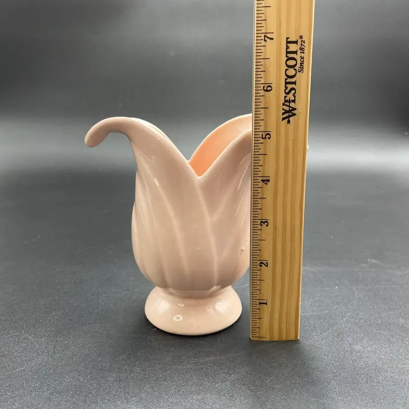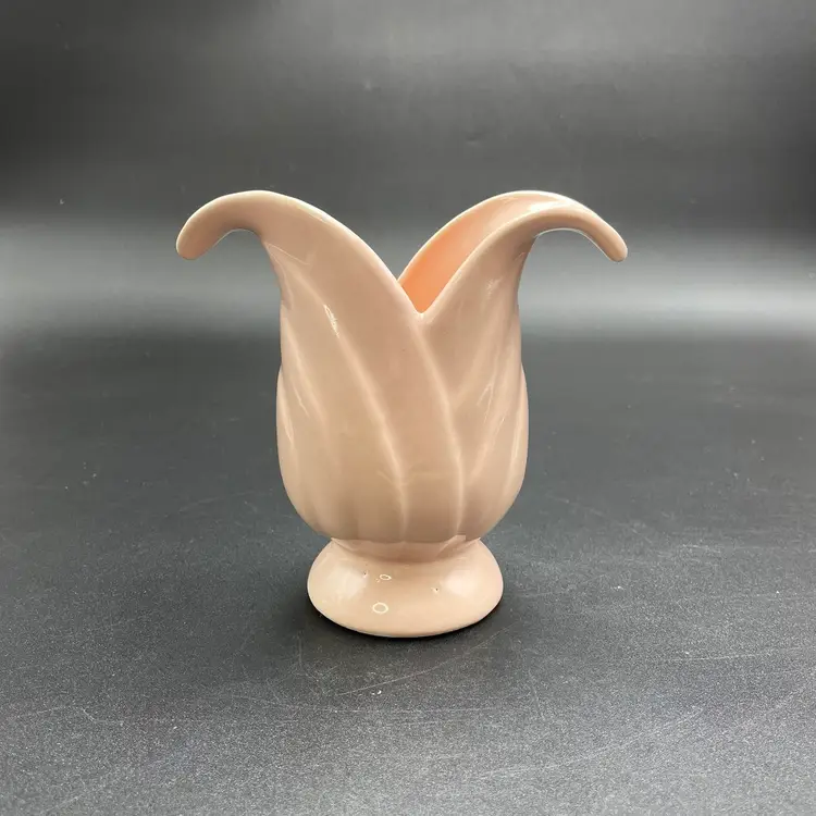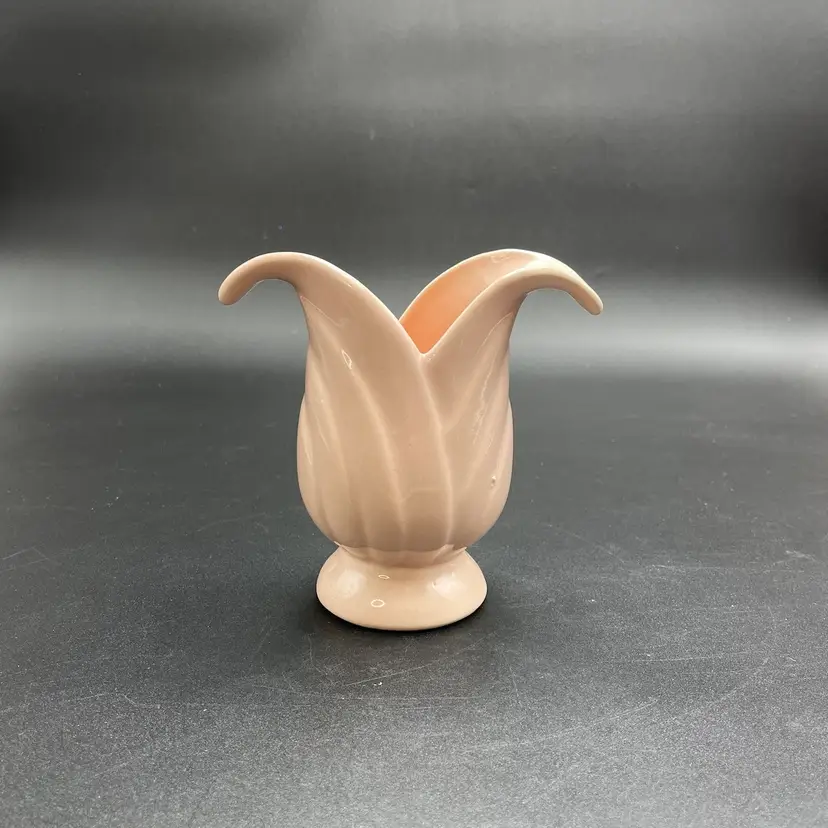 This is a Camark Pottery #827 art deco style pink tulip vase. Made in USA. Measures approximately 5" tall x 5" across x 2.5" wide. There is a makers flaw on one side. It is a glazed over bump as shown in pictures. No major flaws. #235