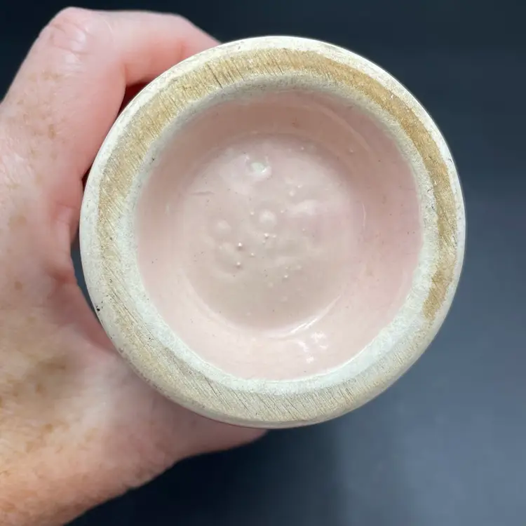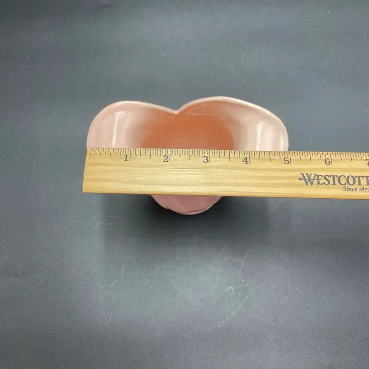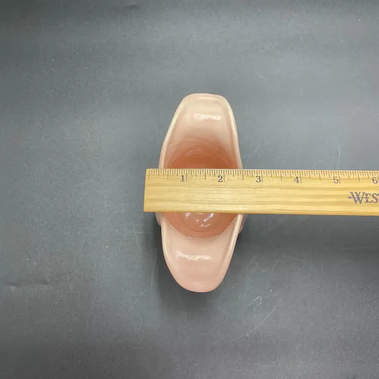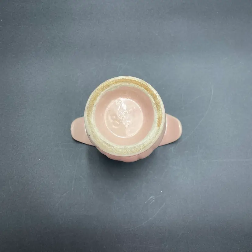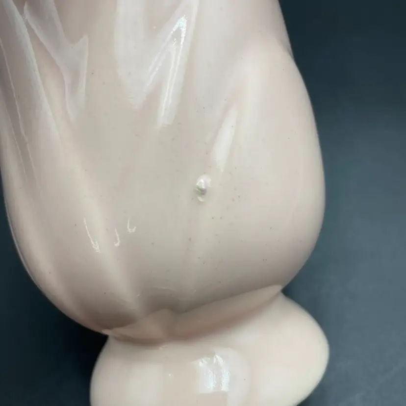 This is a Camark Pottery #827 art deco style pink tulip vase. Made in USA. Measures approximately 5" tall x 5" across x 2.5" wide. There is a makers flaw on one side. It is a glazed over bump as shown in pictures. No major flaws. #235