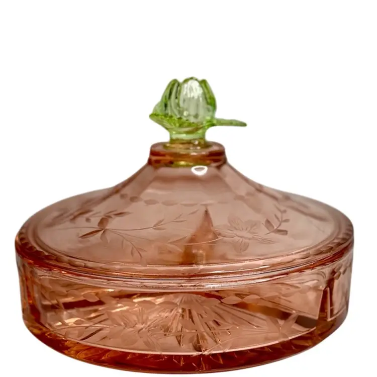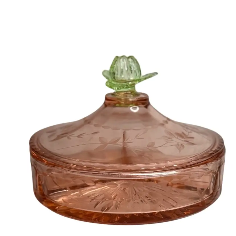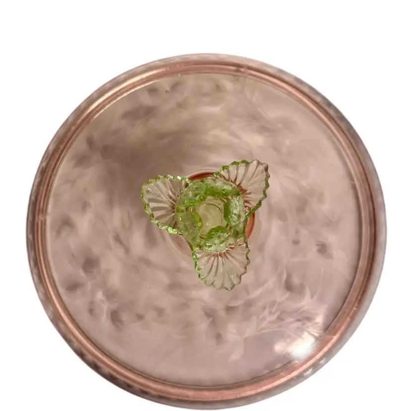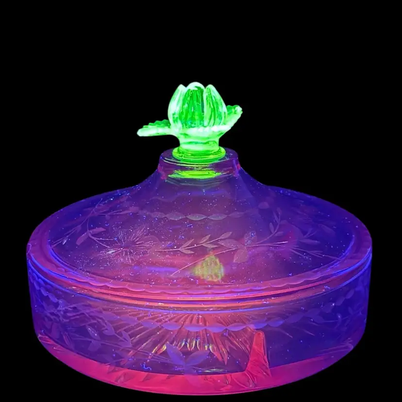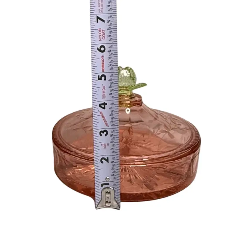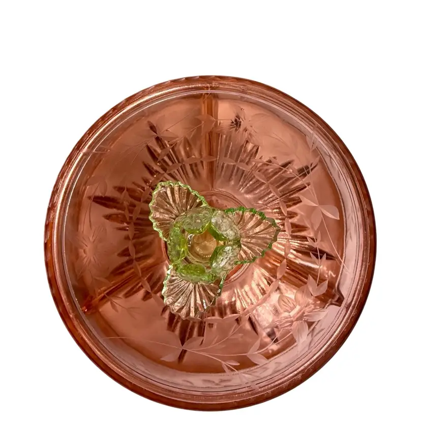 Cambridge divided covered candy dish. Depression Pink uranium finial. Uranium & cadmium glow with 365 UV Light Just the finial glows with 395 UV Light. Hard to find.
