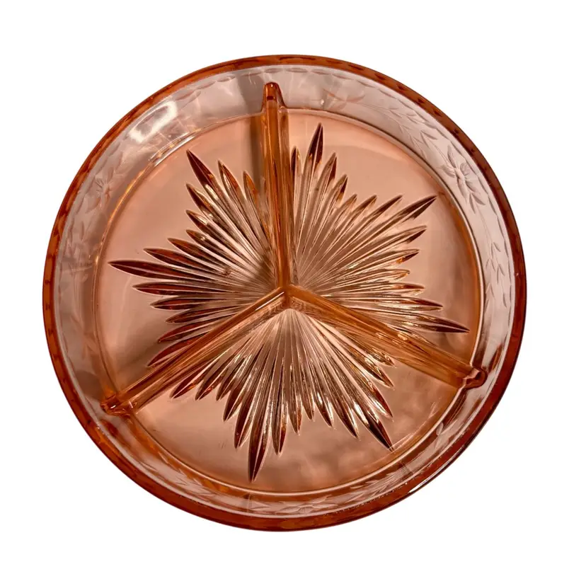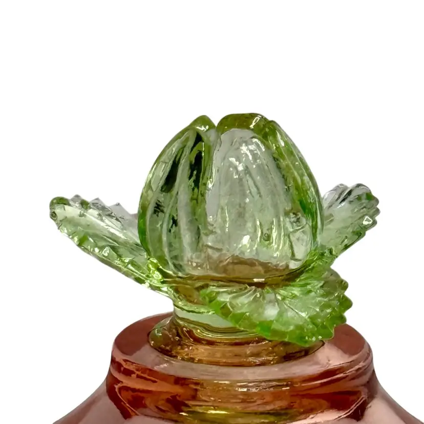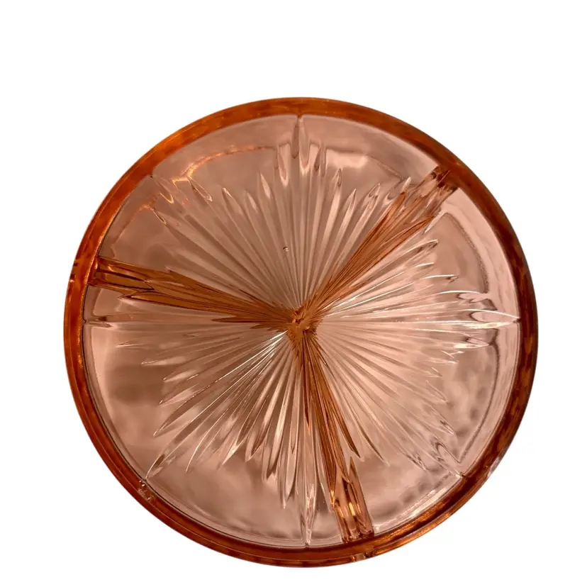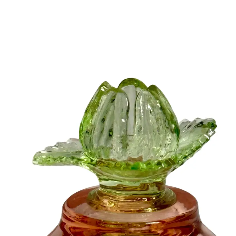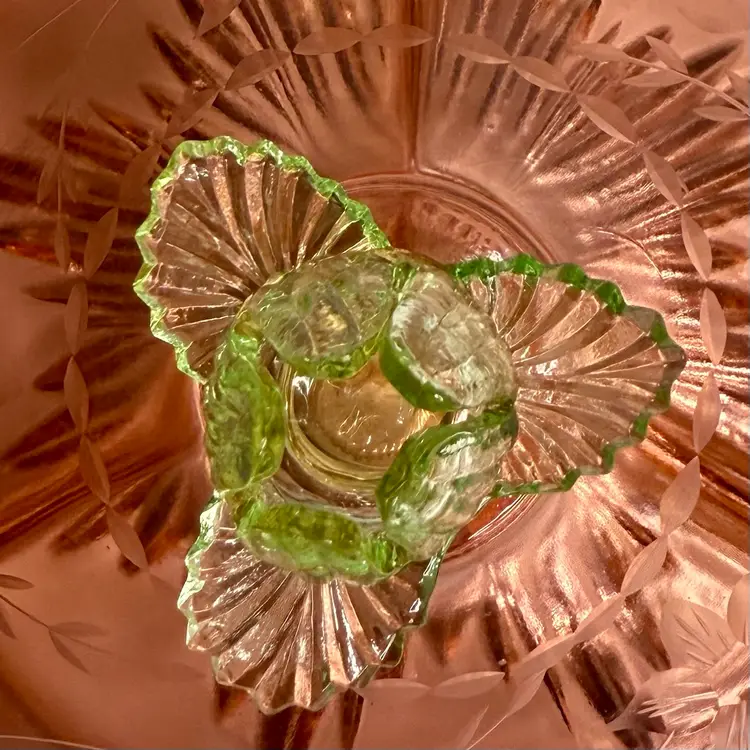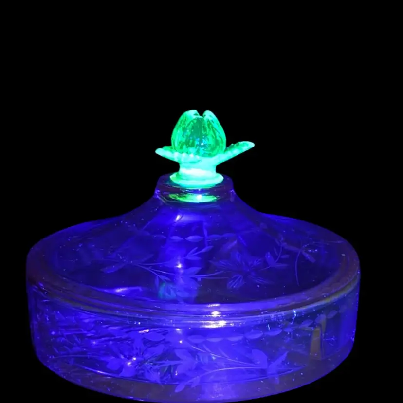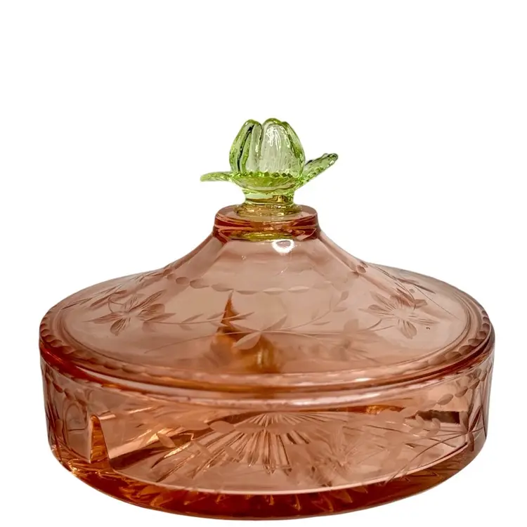 Cambridge divided covered candy dish. Depression Pink uranium finial. Uranium & cadmium glow with 365 UV Light Just the finial glows with 395 UV Light. Hard to find.