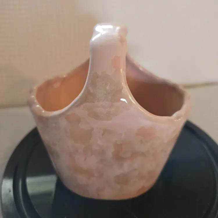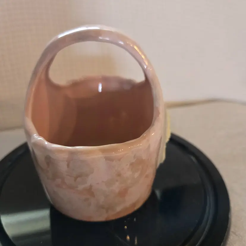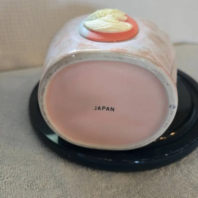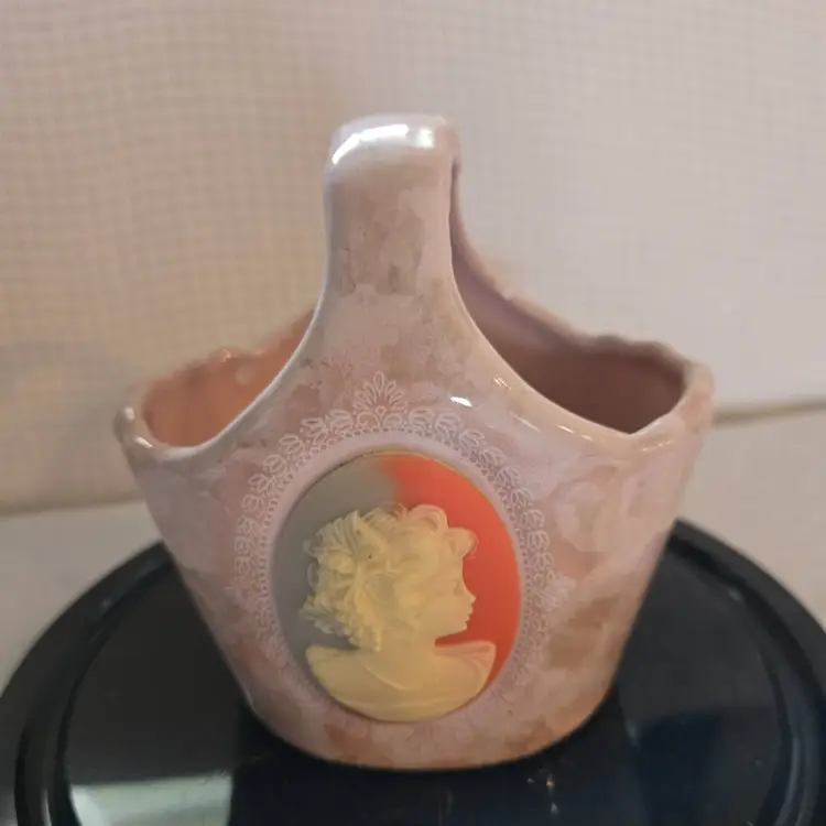 Beautiful pink cream blush colored basket with a cameo on the front. It has Japan stamped on the bottom. Stands 4 1/4" tall, 4 1/2" wide, and 3" deep.
