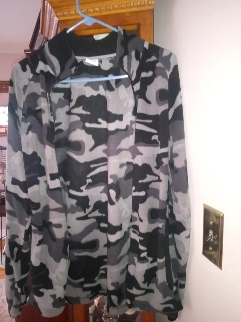 COZY CAMO PRINT CARDIGAN IN GRAY AND BLACK TONES, PERFECT FOR LAYERING.