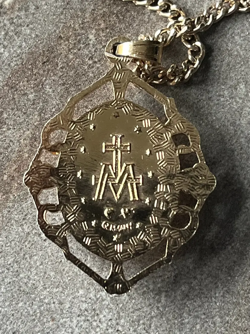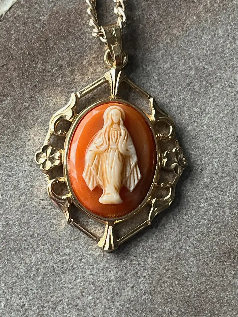 A cameo style necklace. Plastic cameo. Gold tone. 18 inch. The back has alot of information on the back as seen in the photo. I believe it says Germany at the very bottom. Not an expensive necklace but it is made well.