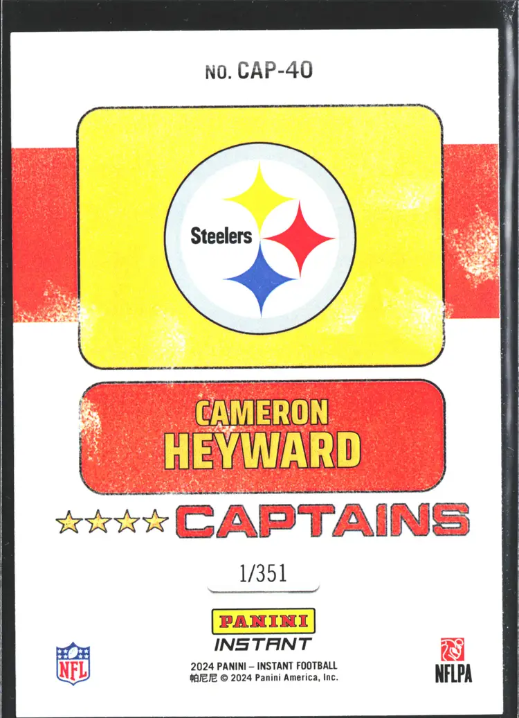 1st time buyer? Get $5 Off with code DISTRICT5 at checkout! Card as shown. All cards $20 and under ship PWE via lettertrackpro [https://www.letter-track.com/registerap.asp?AFID=8757] Player/Athlete: Cameron Heyward Sport: Football Type: Sports Trading Card League: National Football League (NFL), National Collegiate Athletic Association (NCAA) Manufacturer: Panini Season: 2024 Team: Pittsburgh Steelers Set: 2024 Panini Instant NFL Features: Limited Edition, Serial Numbered Autographed: No Year Manufactured: 2024 Original/Licensed Reprint: Original Vintage: No Graded: No Country/Region of Manufacture: United States