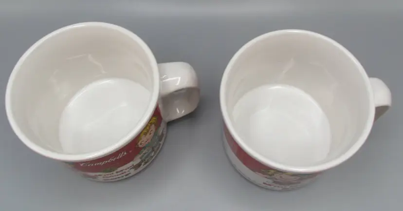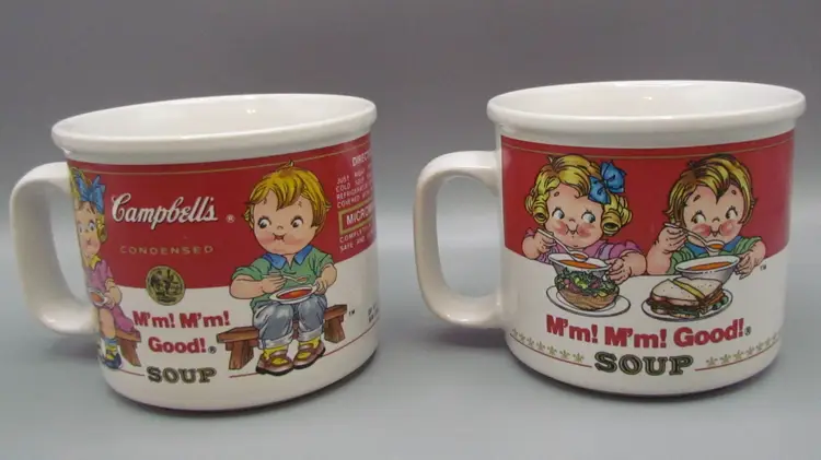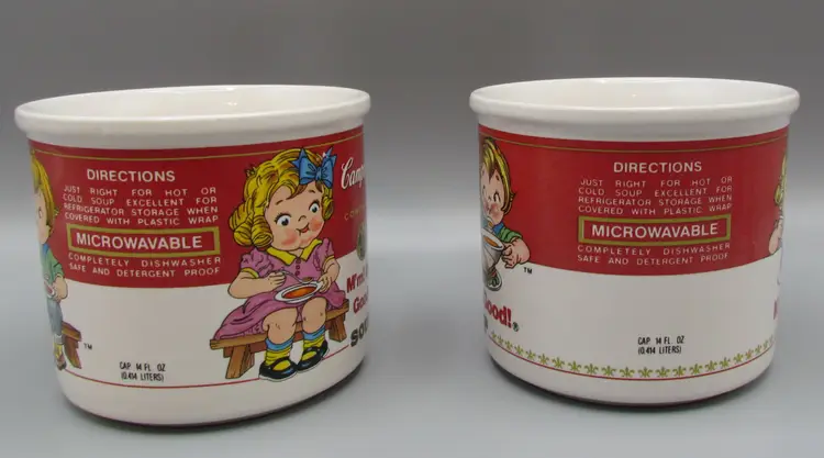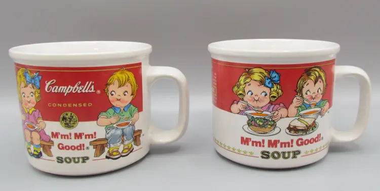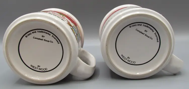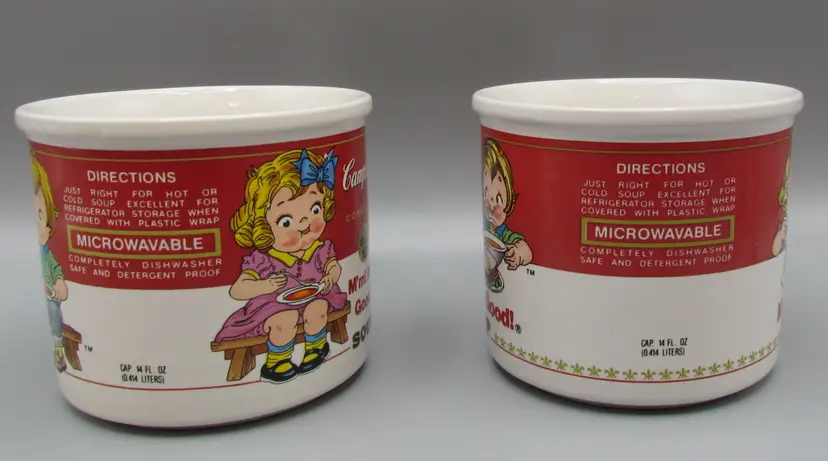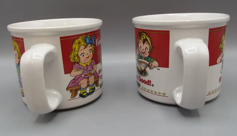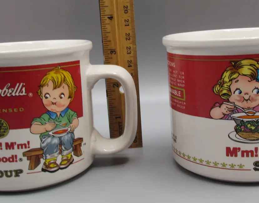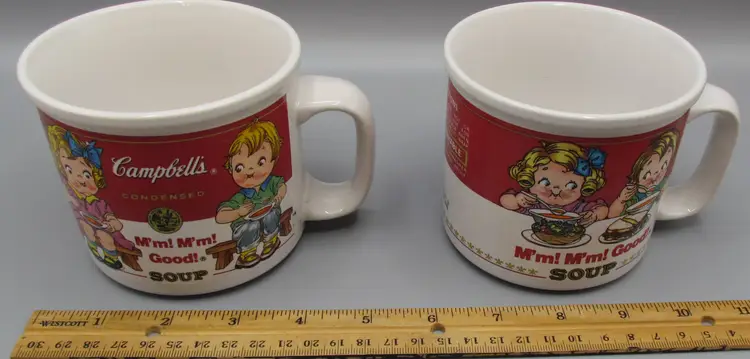 Campbell Soup Kids M'm! M'm! Good! Vintage 1993 Soup Mugs By West Wood 14oz Set of 2 One mug has boy and girl on benches and the other has boy and girl eating soup with a salad and a sandwich Measurements in photos Like new condition, no chips or cracks, please see photos as they are part of the description.