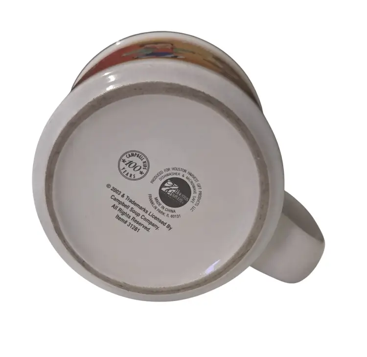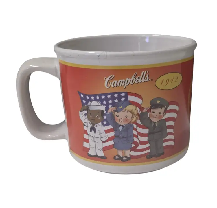 The Campbell's Kids Soup Bowl Cup Mug is a special edition collectible item commemorating the brand's 100 years, featuring a patriotic theme with the armed forces flag and dancing design. This mug is perfect for enjoying a hot beverage while serving as a nostalgic piece of dinnerware from the iconic Campbell's Kids series.