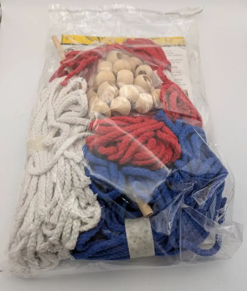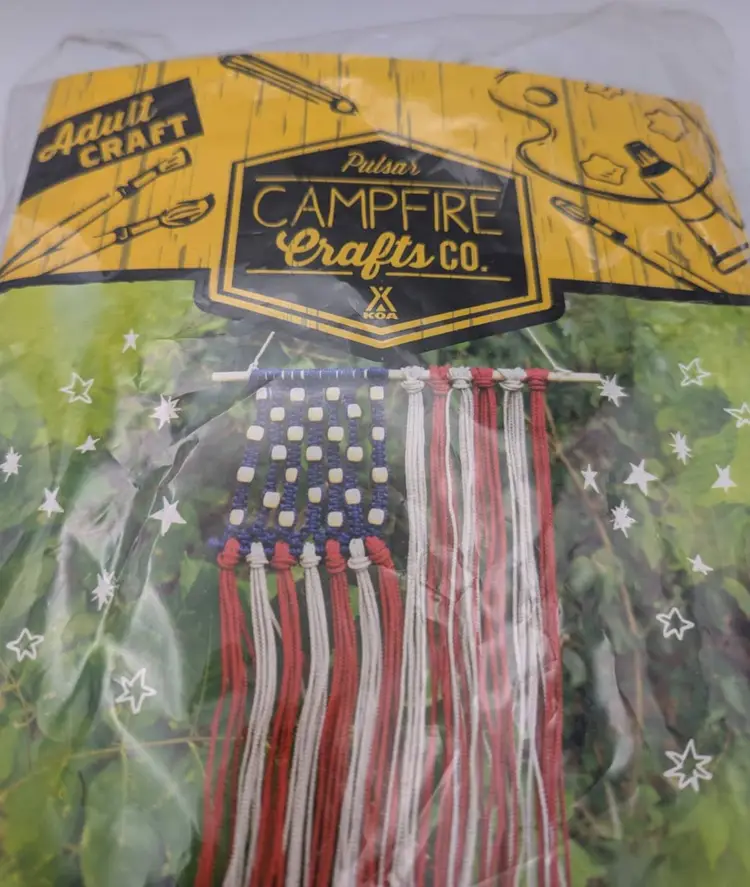 This is a complete set to make a Macrame Flag- just in time for 4th of July! Macrame yarn, beads and a wooden dowel. This is not full length or full count stars and stripes. It was originally available to KOA site campers. Pulsar- 2018. It is new in package- though the top flap has come loose- and I taped it closed. Non smoking home Non pet home.