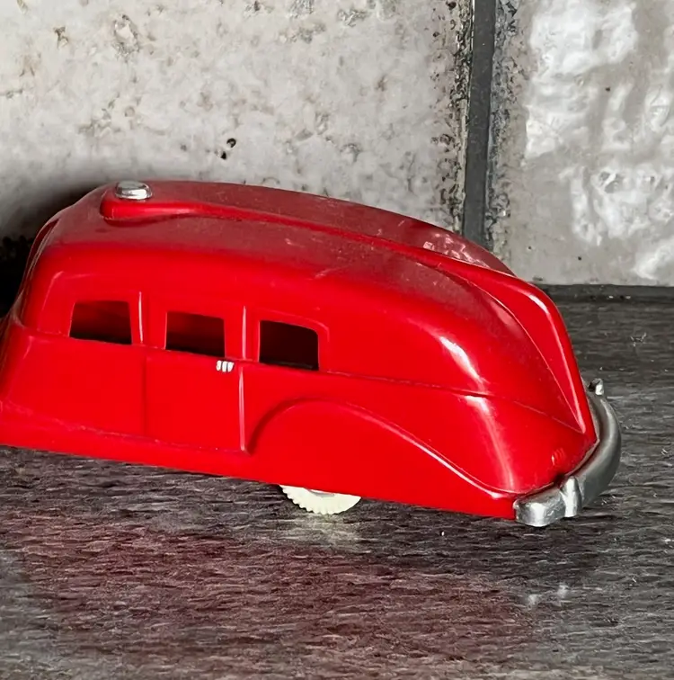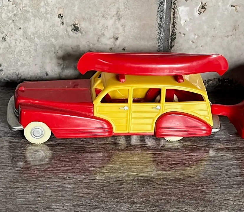 A set of camping toys. Included are a station wagon, travel trailer and canoe. Plastic. In original box. Launched in 2000 by Binary Arts Corp.