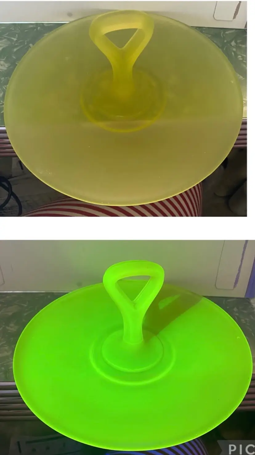 Canary satin tidbit server vaseline glass. Possibly Tiffin. Glows like crazy! One bubble as pictured. 9 1/2”.