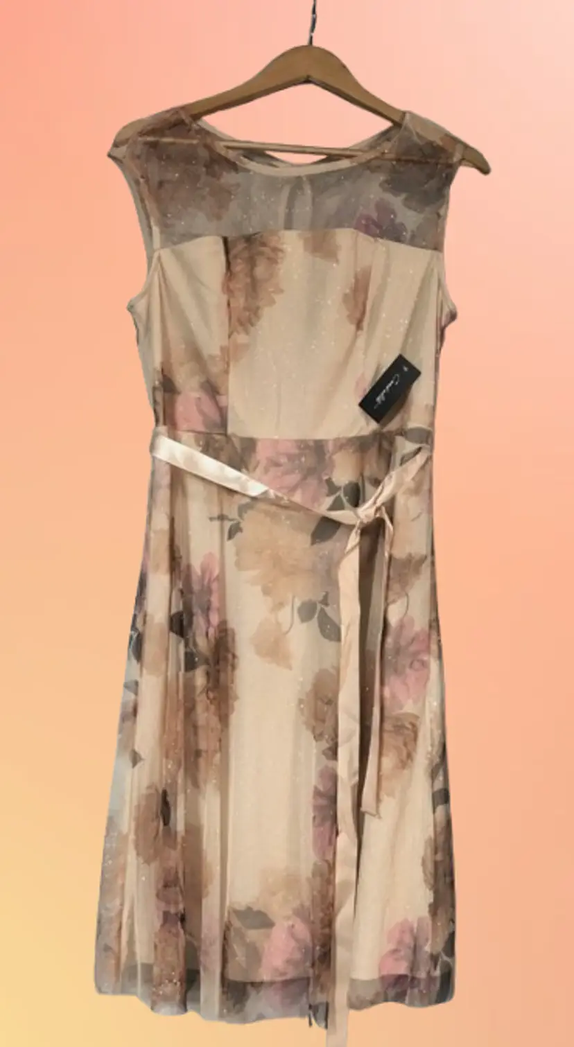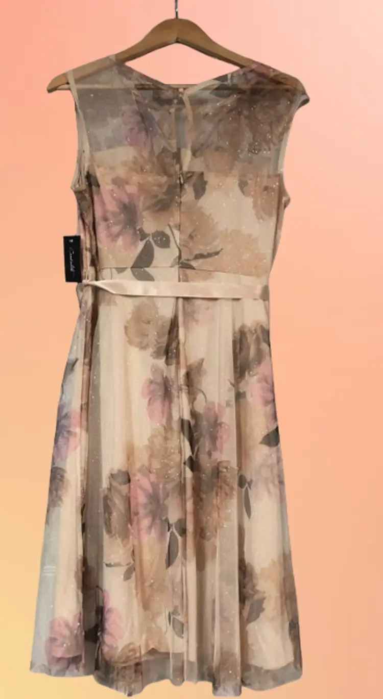 Candalite dress, pink, floral, sparkly, sparkly, fairy-style, made of tulle-like chiffon, sheer neckline.