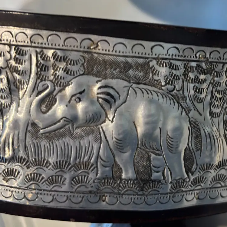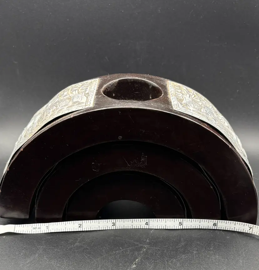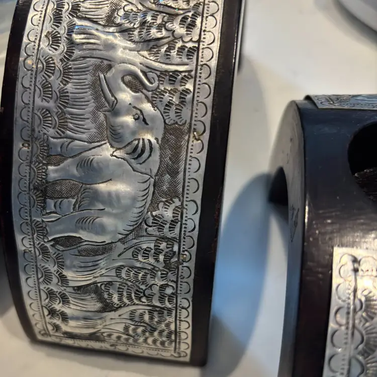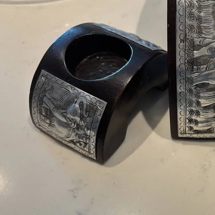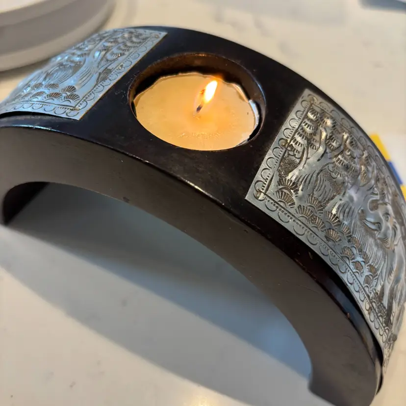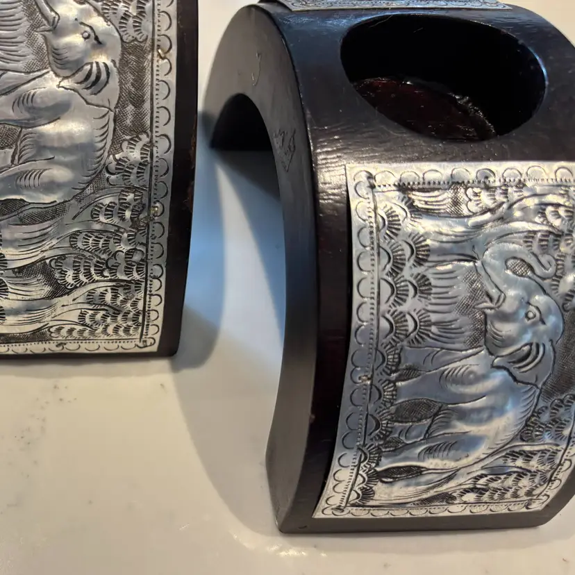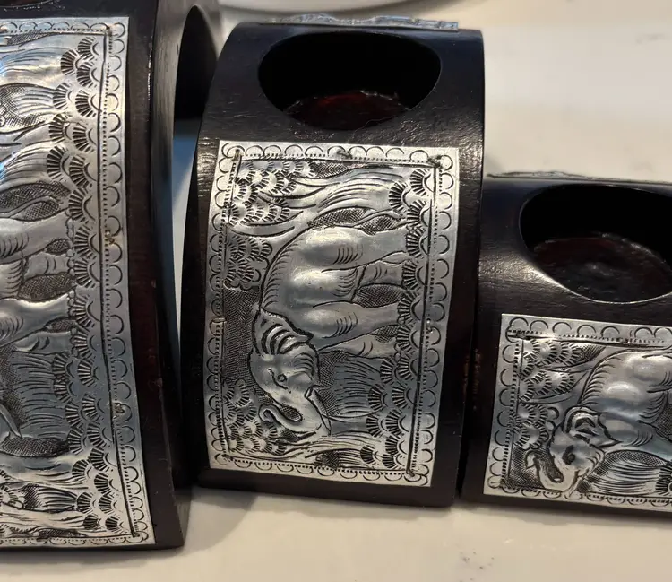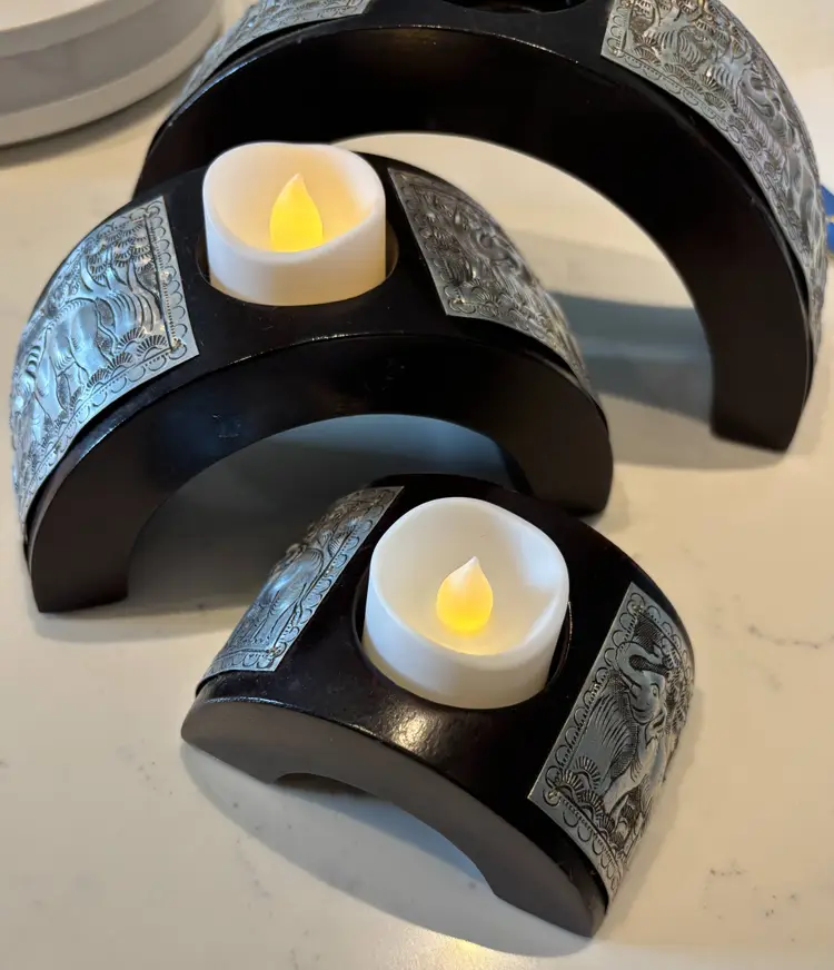 This set of tea light candle holders is made of dark wood with embossed metal plates, which might be tin. (Origin and maker unknown.) There are three nesting arches, which look great as a display and when in use as candle holders. The elephants are charming and detailed. See photos for condition and dimensions.