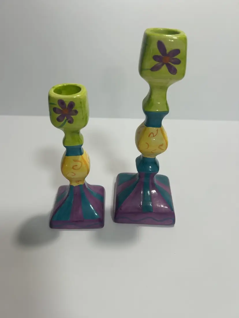 Such a colorful pair of hand-painted ceramic candlestick holders and in mint condition. The tallest measures approximately 8’ tall and shorter one 6” tall. (BSA2)